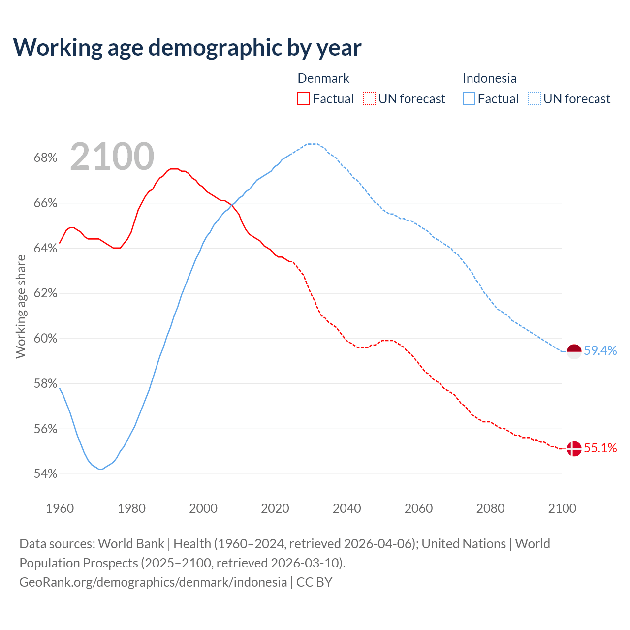Median age Denmark vs Indonesia, 1960-2100