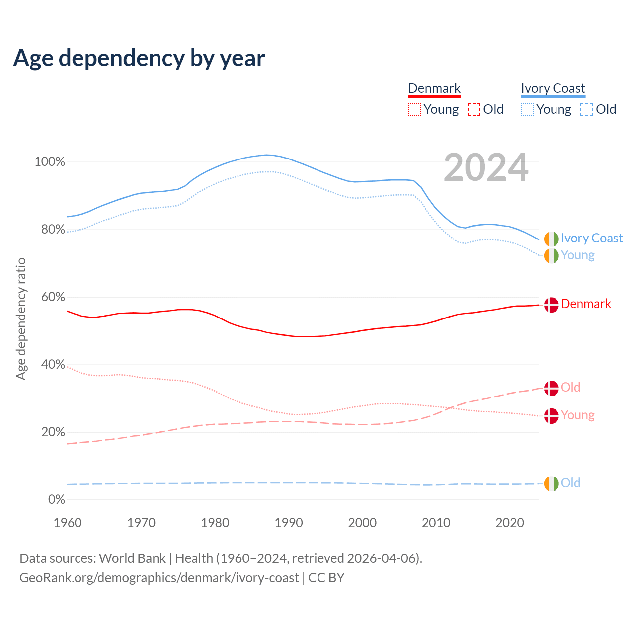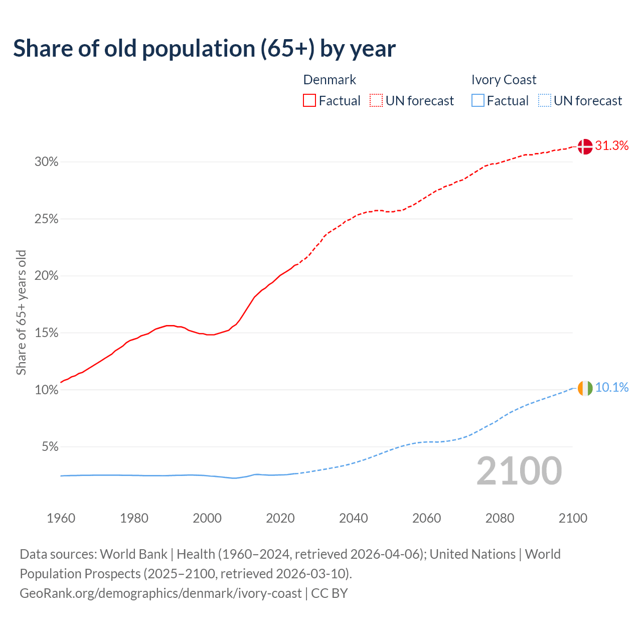 The share of older people aged 65 and over is 20.9% in Denmark and 2.61% in Ivory Coast. Life expectancy in Denmark compared to Ivory Coast .