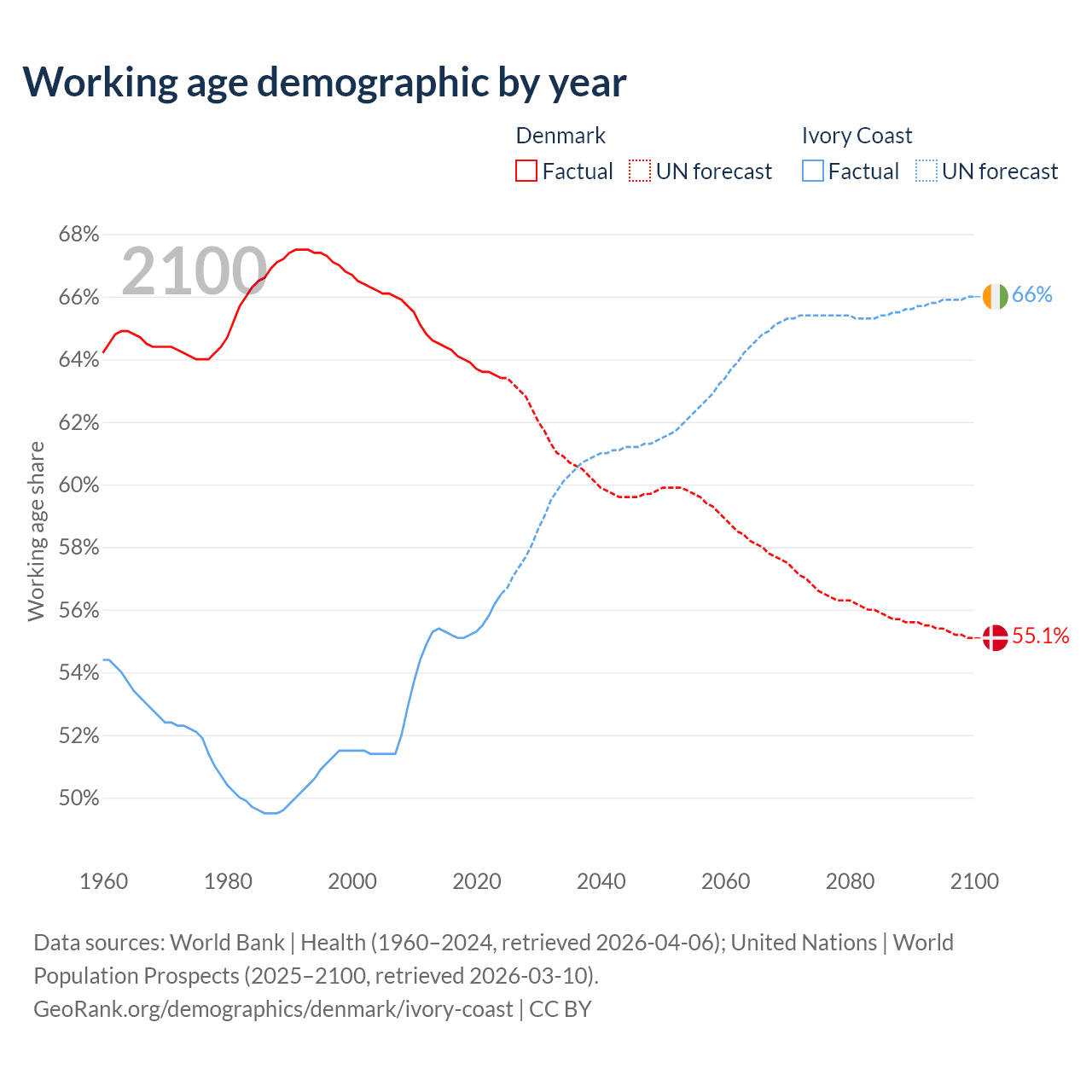 - Denmark has 3.83M working age adults (aged 15-64) vs 19.1M in Ivory Coast.