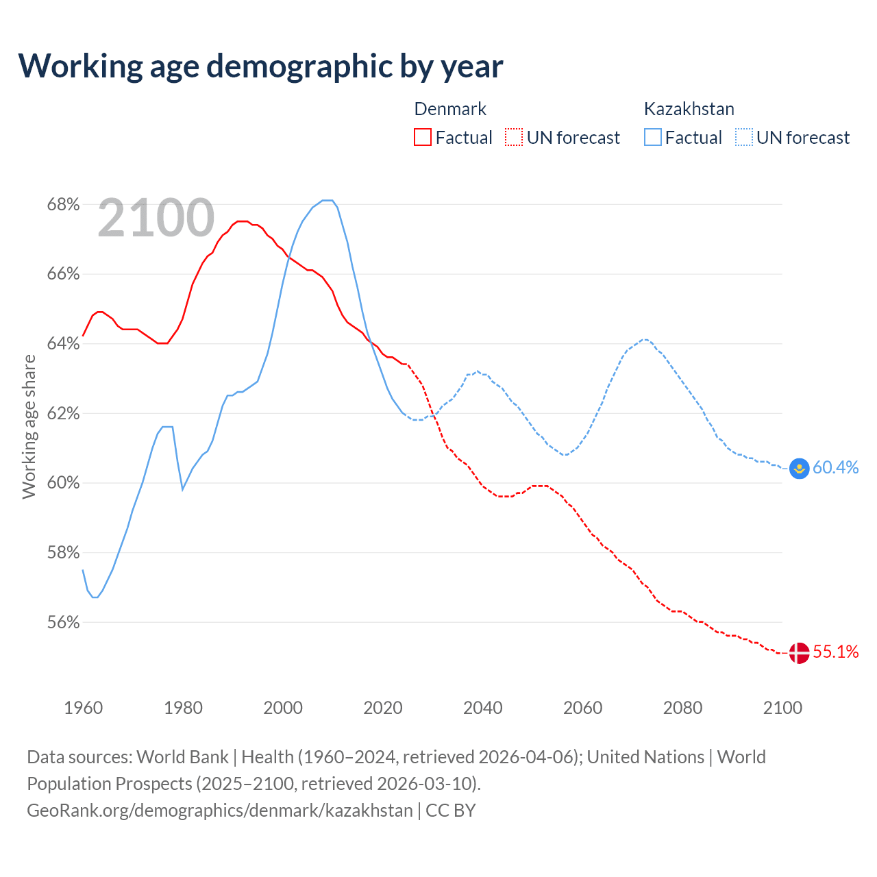 - Denmark has 3.83M working age adults (aged 15-64) vs 13.1M in Kazakhstan.