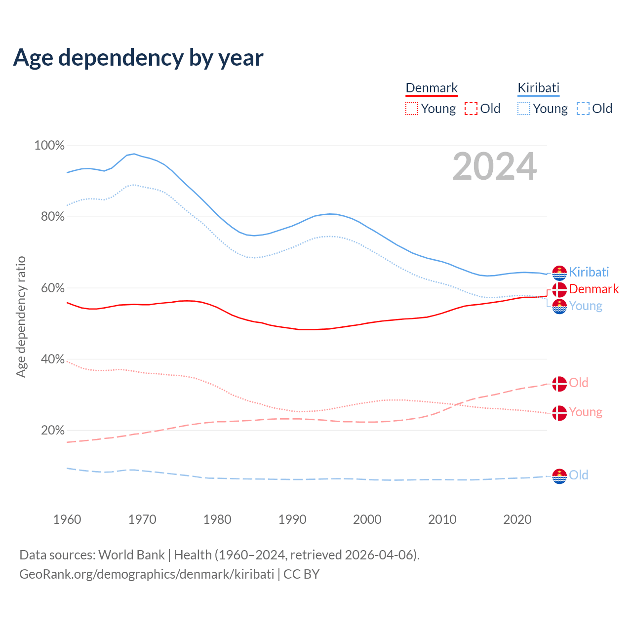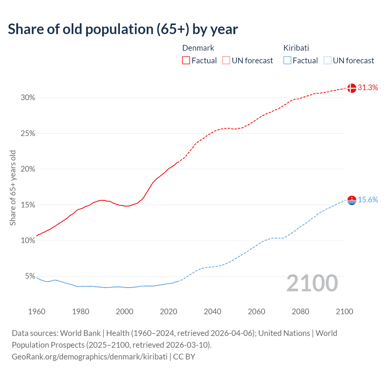- The share of old-age demographic (65+) in Denmark is 20.9% vs 4.24% in Kiribati.