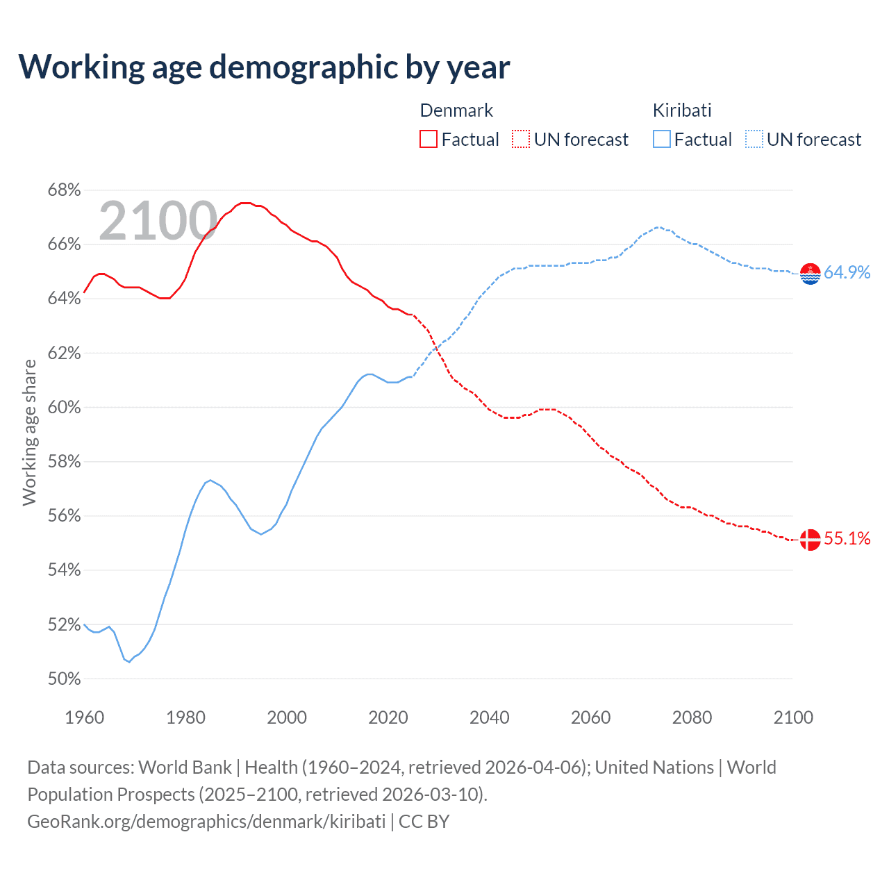 - Denmark has 3.83M working age adults (aged 15-64) vs 84.9K in Kiribati.