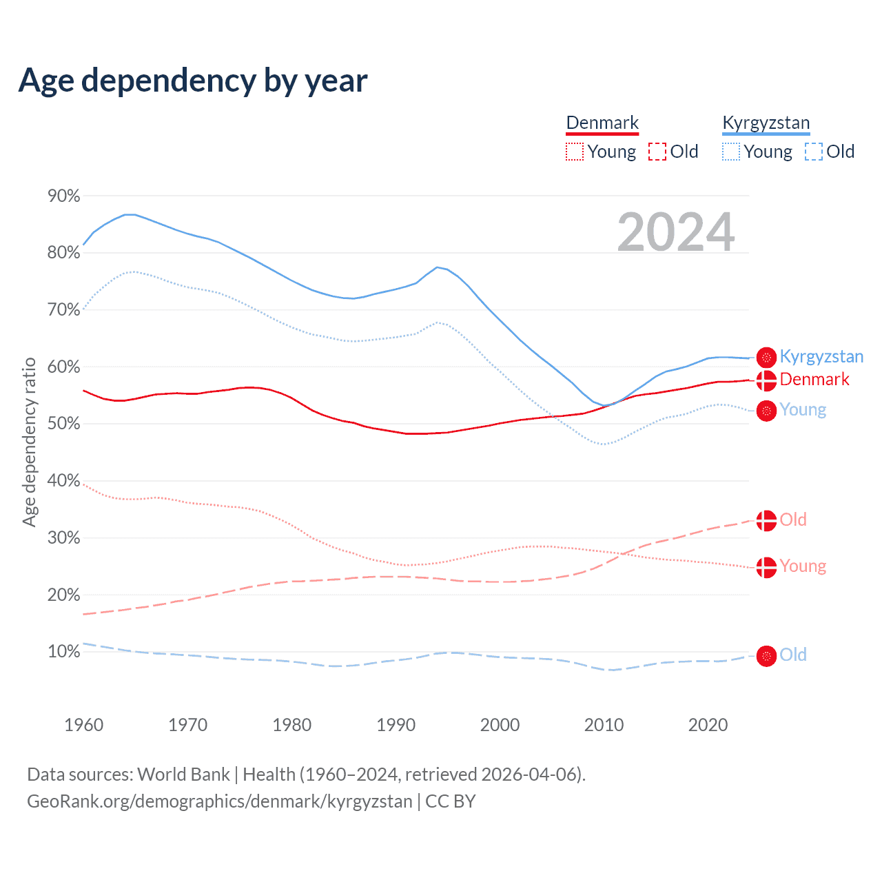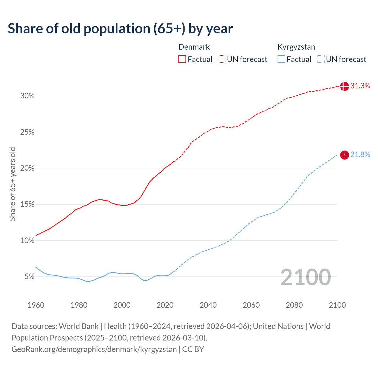- The share of old-age demographic (65+) in Denmark is 20.9% vs 5.68% in Kyrgyzstan.