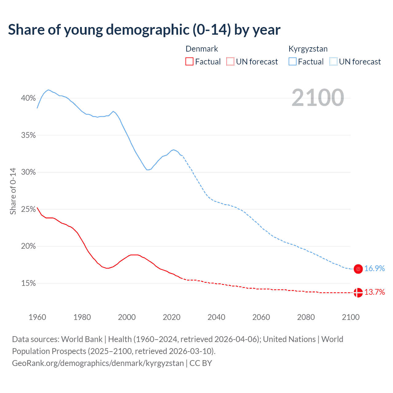 - The share of young demographic (0-15 years old) in Denmark is 15.7% vs 32.3% in Kyrgyzstan.