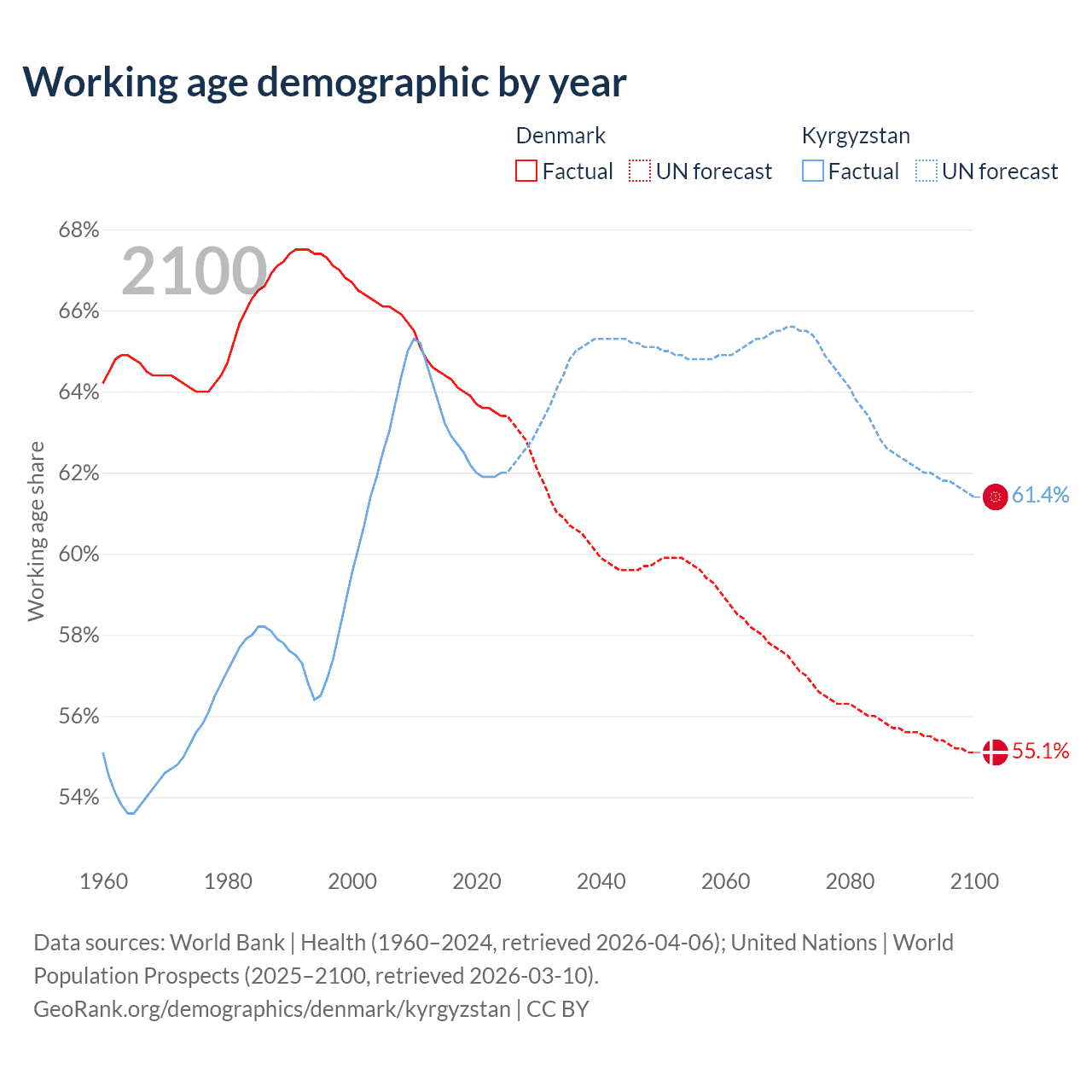 Median age Denmark vs Kyrgyzstan, 1960-2100