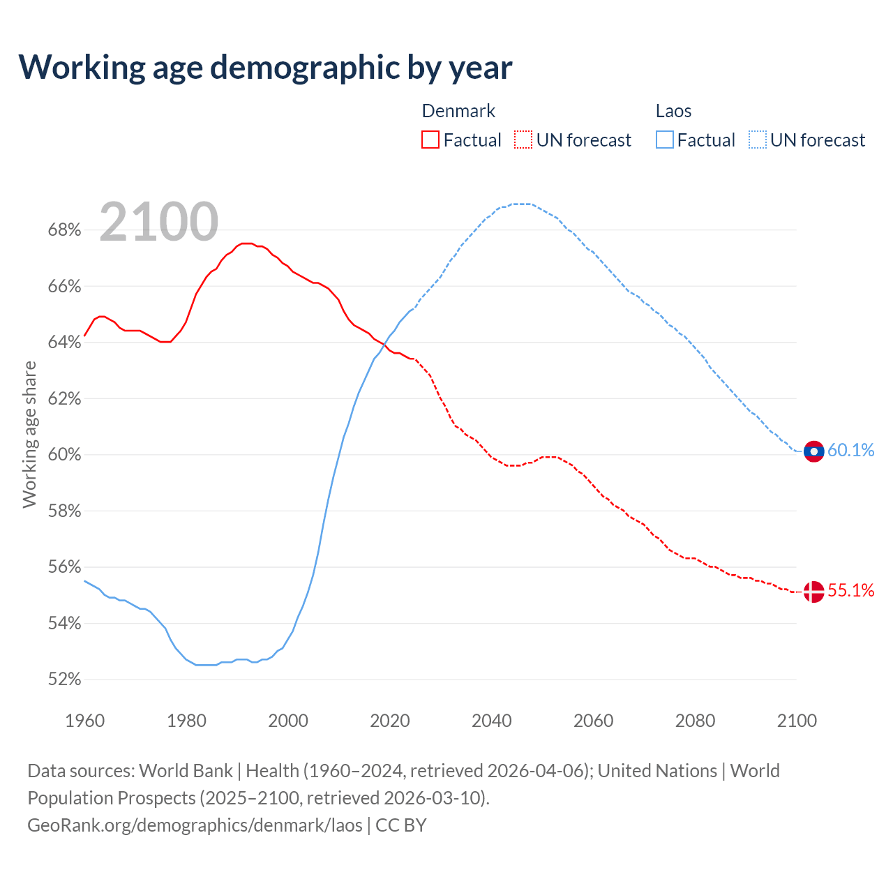 Median age Denmark vs Laos, 1960-2100
