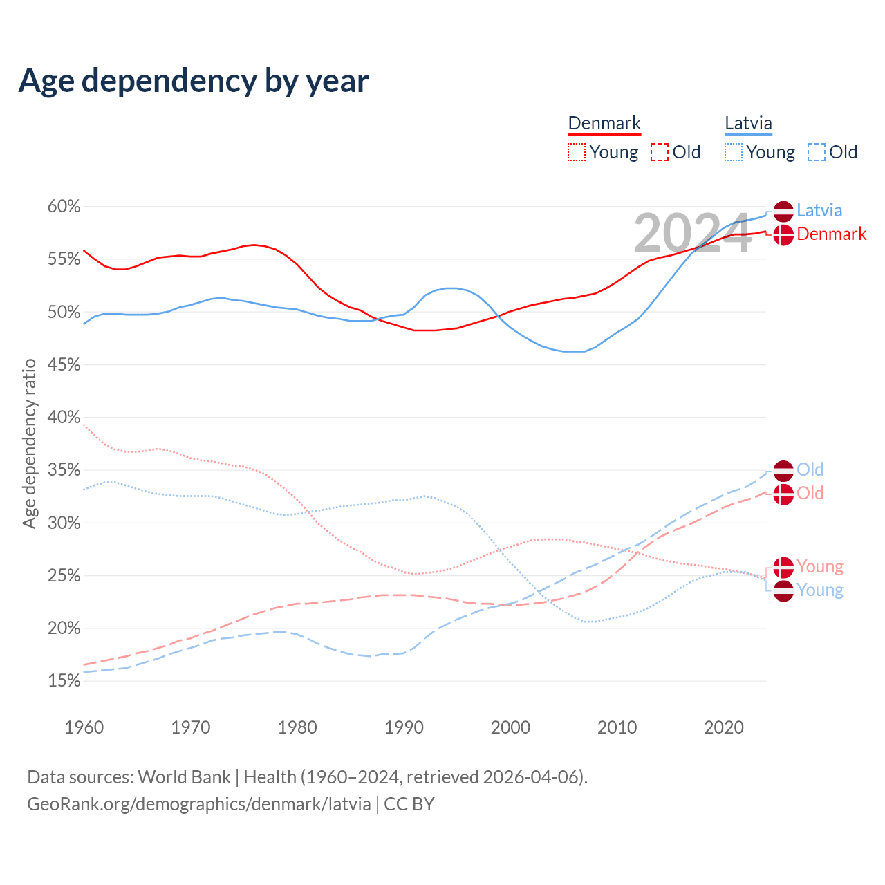 - Denmark is ranked 34/196 by median age (oldest to youngest) vs 20/196 for Latvia.