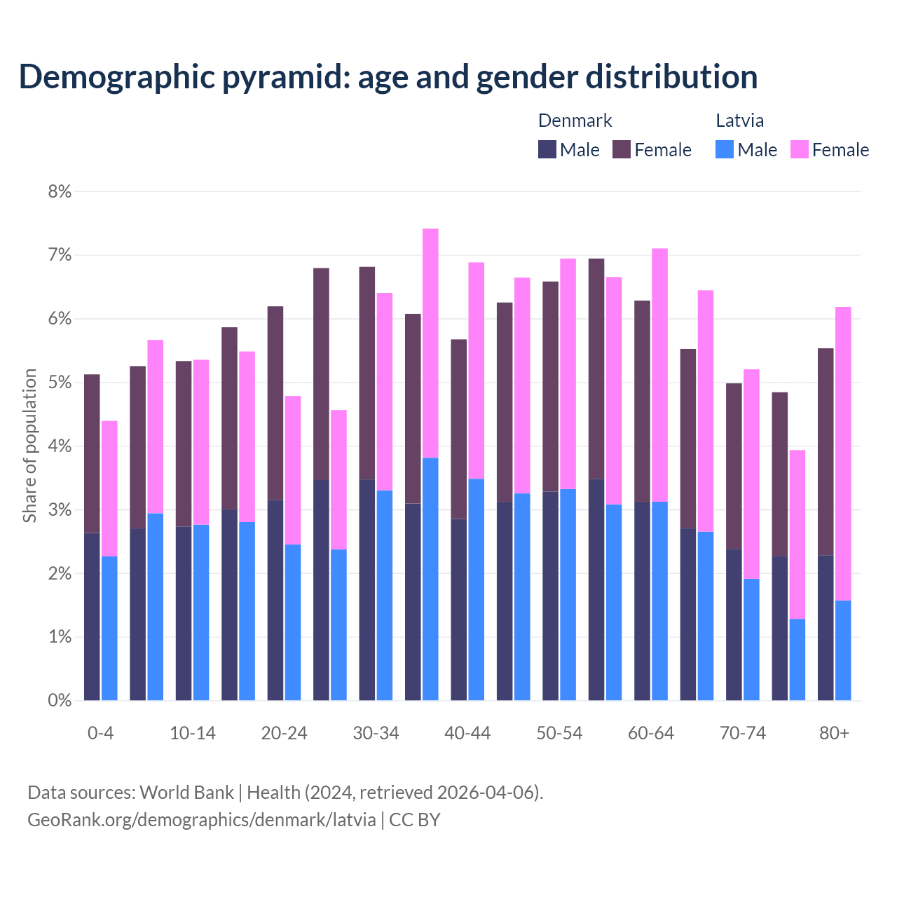 - As of 2026, the population of Denmark is 6.03M vs 1.83M in Latvia - 3.3 times difference.