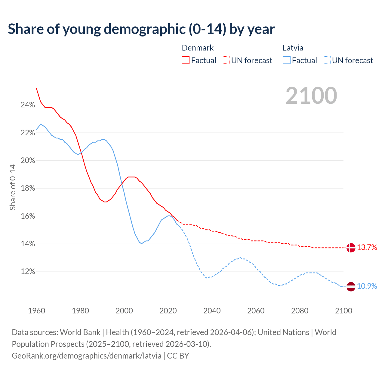 - The share of young demographic (0-15 years old) in Denmark is 15.7% vs 15.4% in Latvia.