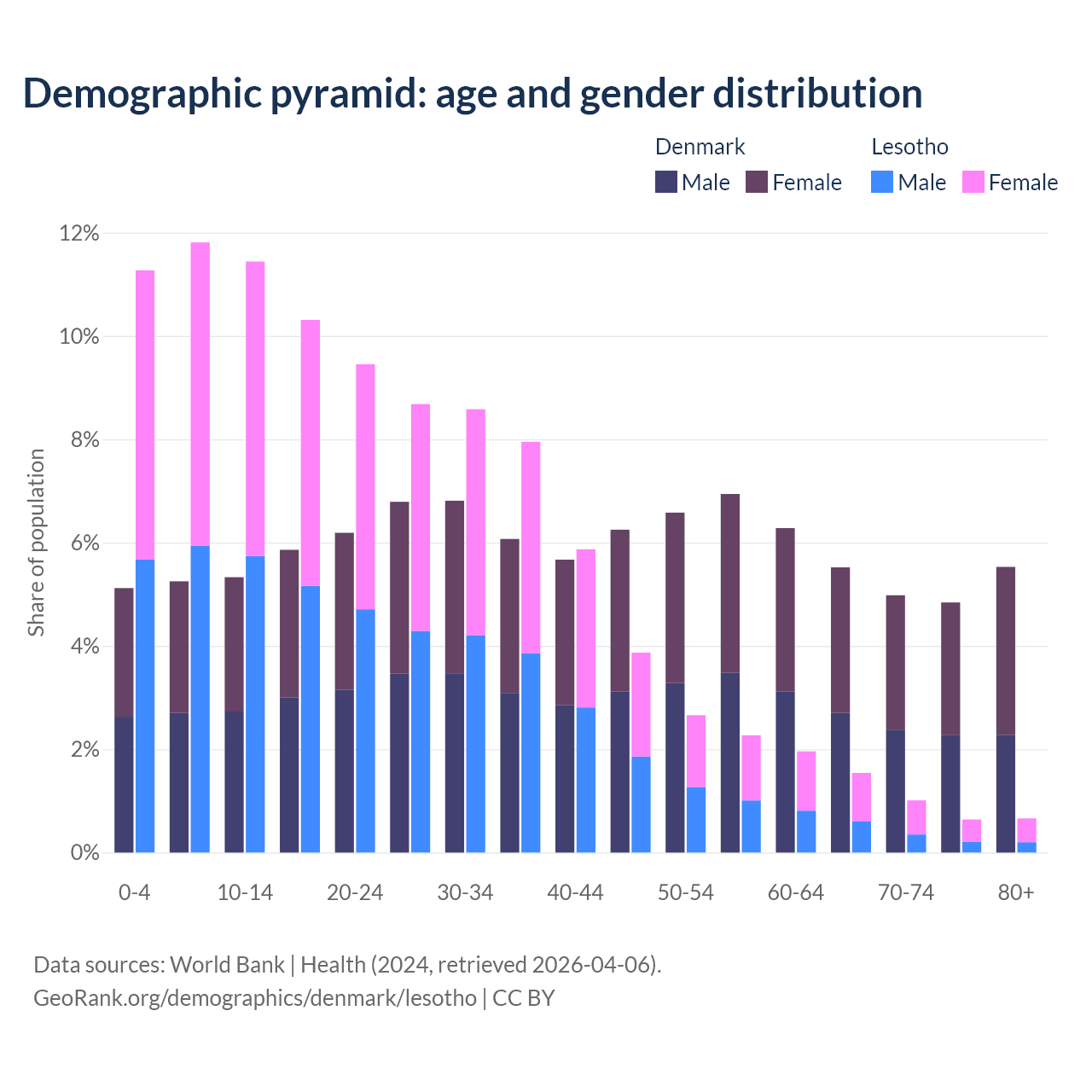 - As of 2026, the population of Denmark is 6.03M vs 2.4M in Lesotho - 2.52 times difference.