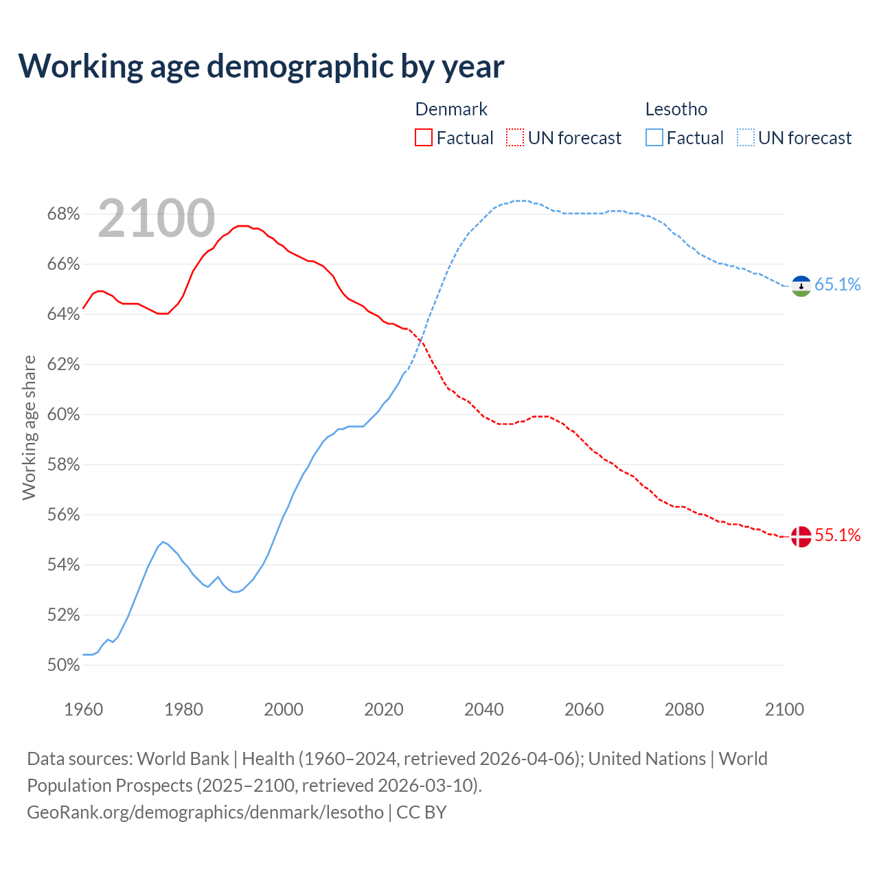 - Denmark has 3.83M working age adults (aged 15-64) vs 1.48M in Lesotho.