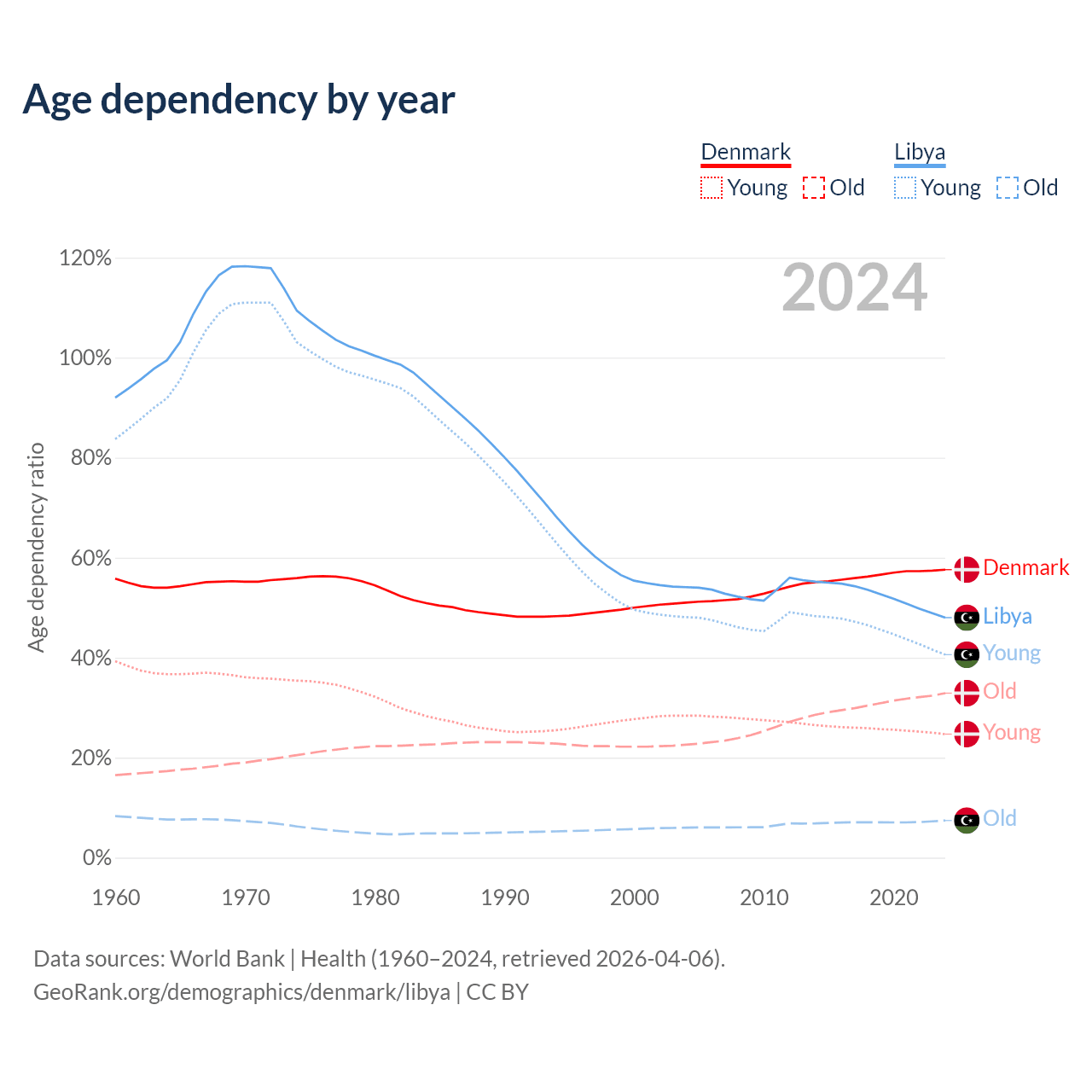 - The share of old-age demographic (65+) in Denmark is 20.9% vs 5.02% in Libya.