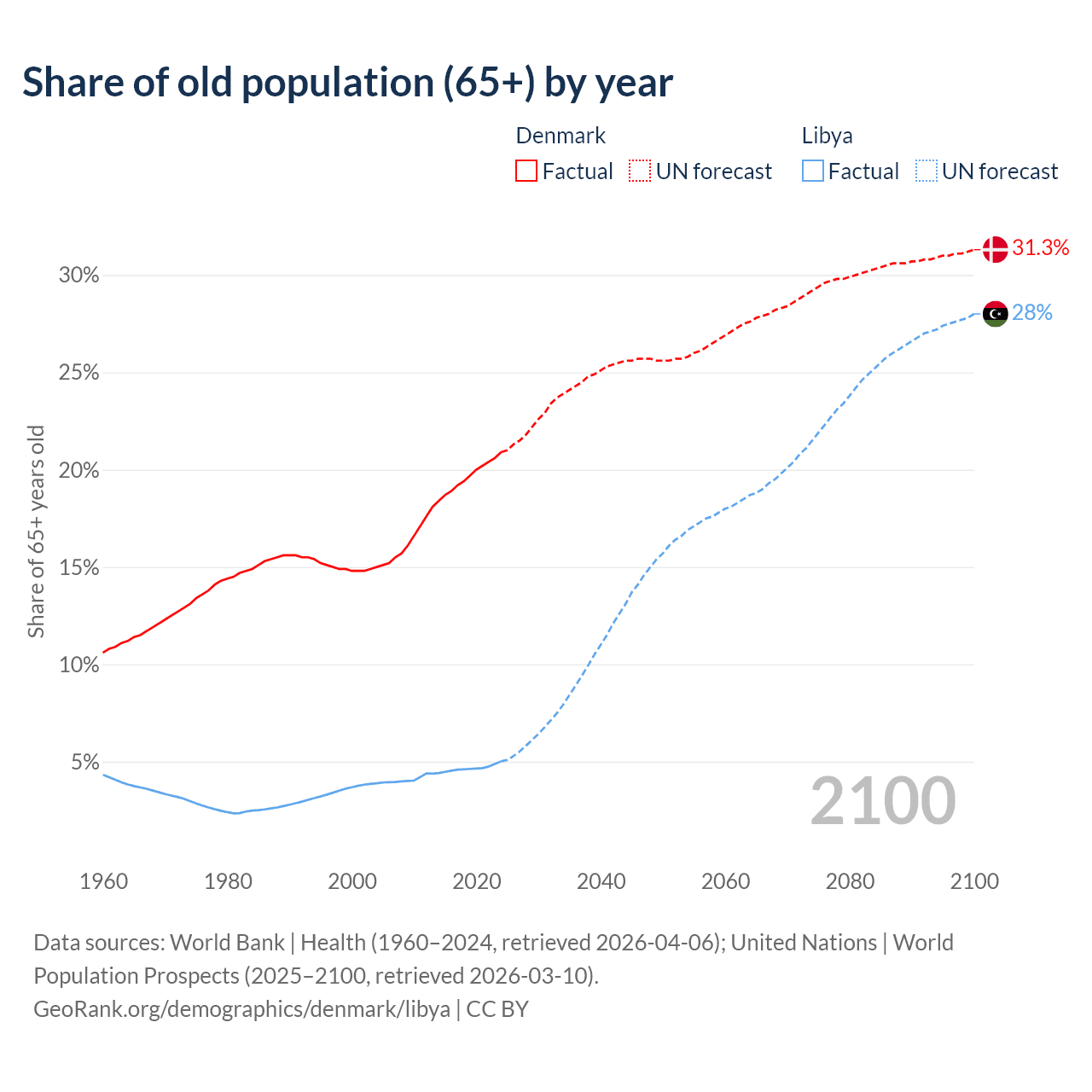 The share of older people aged 65 and over is 20.9% in Denmark and 5.02% in Libya. Life expectancy in Denmark compared to Libya .