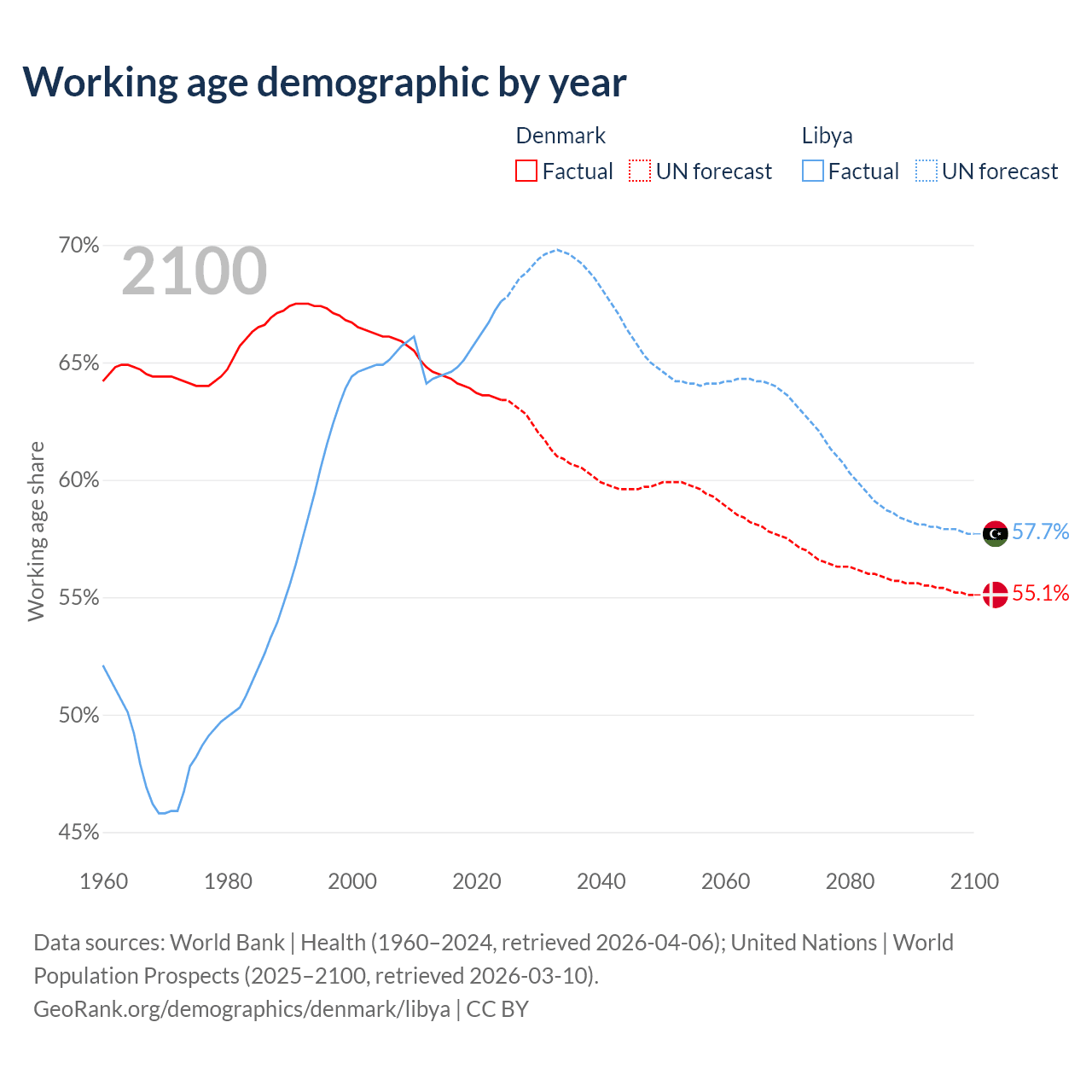 - Denmark has 3.83M working age adults (aged 15-64) vs 5.11M in Libya.
