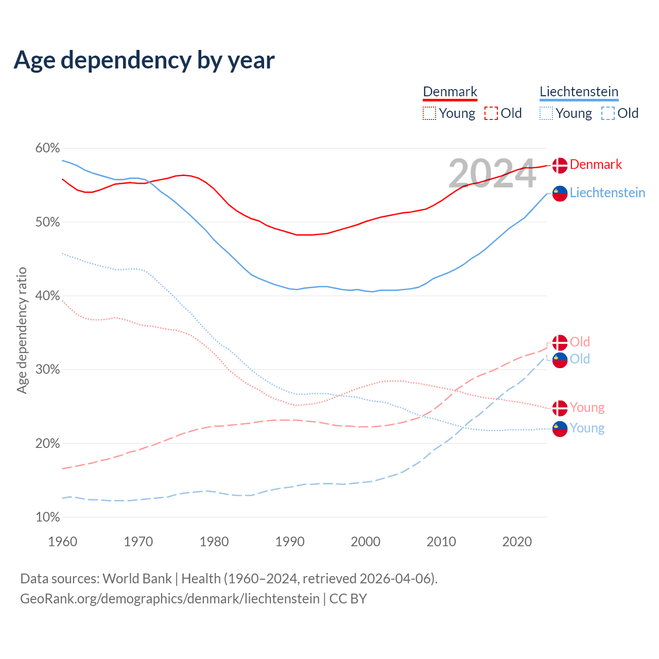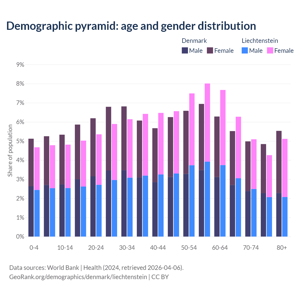 - The share of old-age demographic (65+) in Denmark is 20.9% vs 20.7% in Liechtenstein.