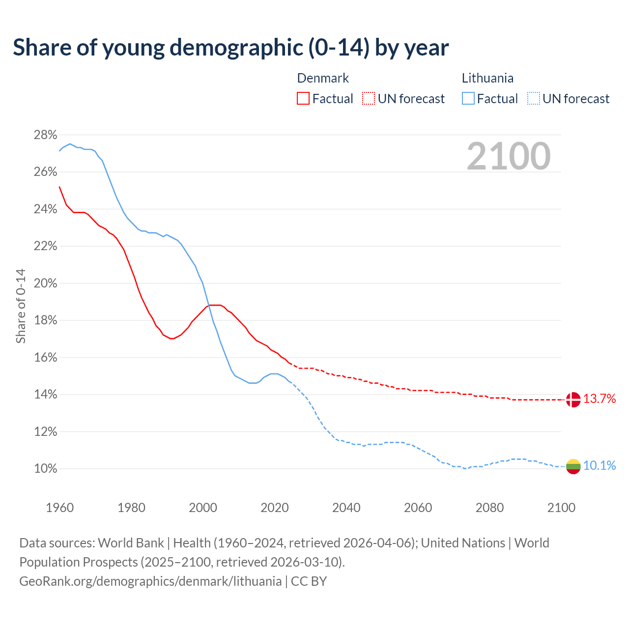 - The share of young demographic (0-15 years old) in Denmark is 15.7% vs 14.7% in Lithuania.