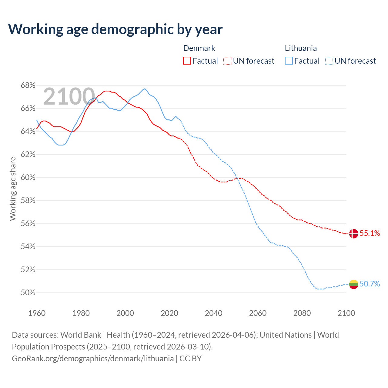 Median age Denmark vs Lithuania, 1960-2100