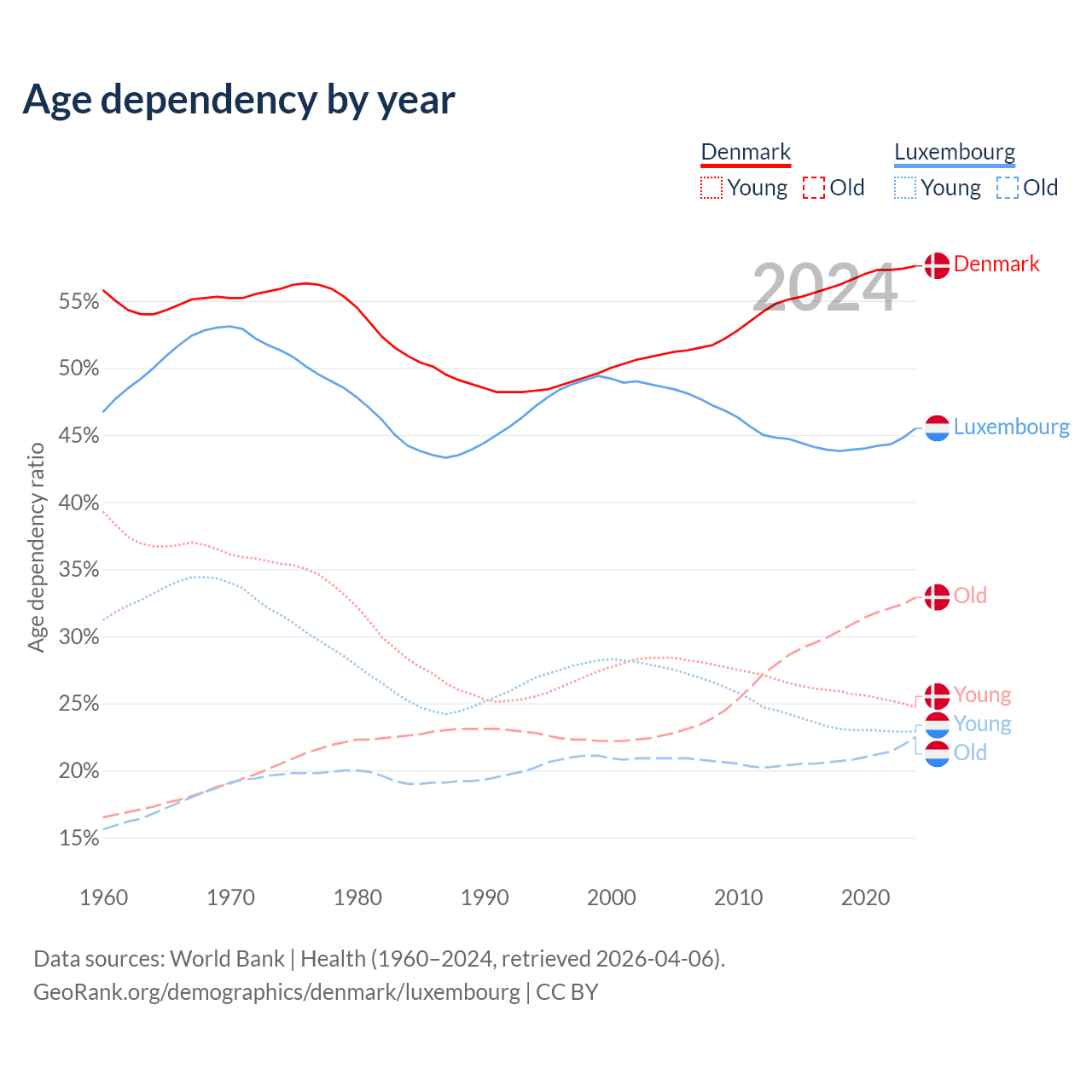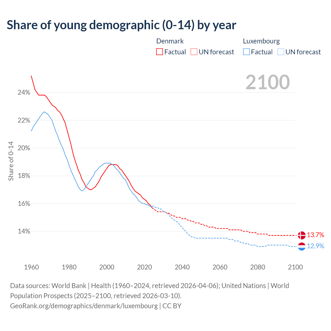 - The share of young demographic (0-15 years old) in Denmark is 15.7% vs 15.8% in Luxembourg.