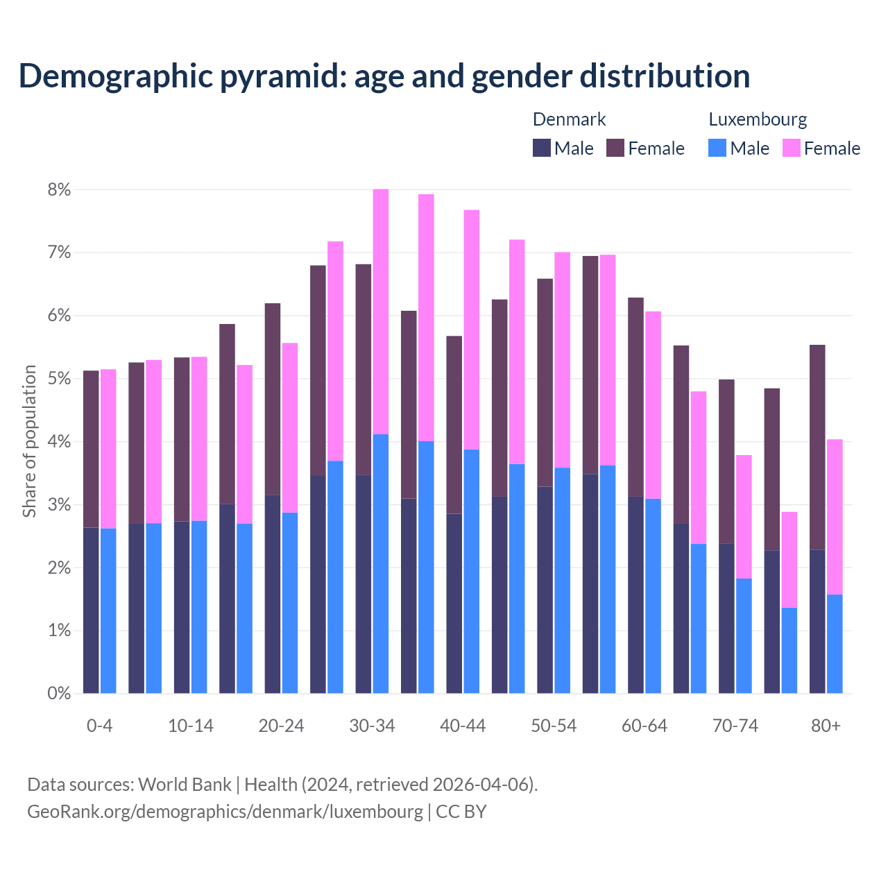 - Denmark is ranked 34/196 by median age (oldest to youngest) vs 46/196 for Luxembourg.