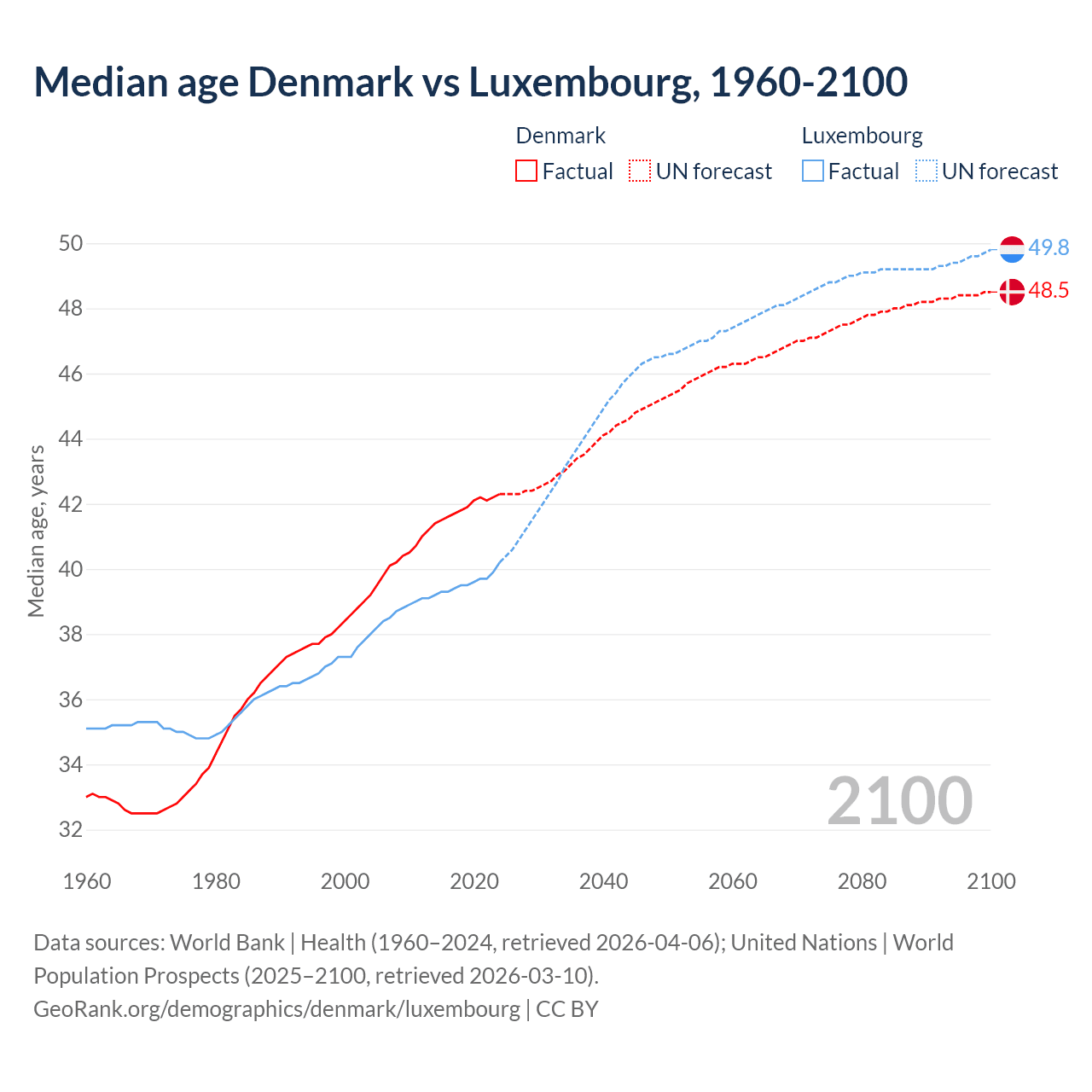 Median age Denmark vs Luxembourg, 1960-2100
