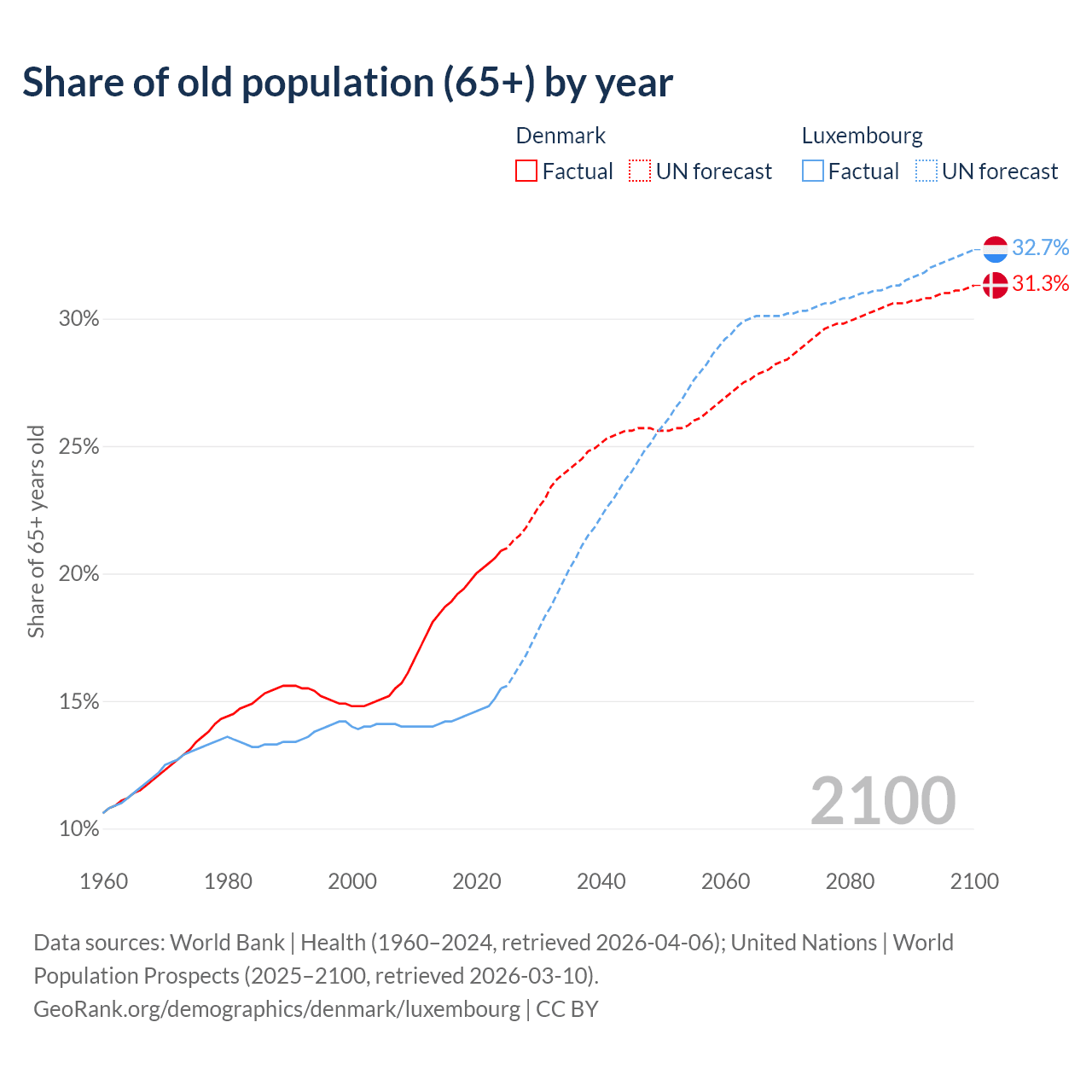 - The share of old-age demographic (65+) in Denmark is 20.9% vs 15.5% in Luxembourg.