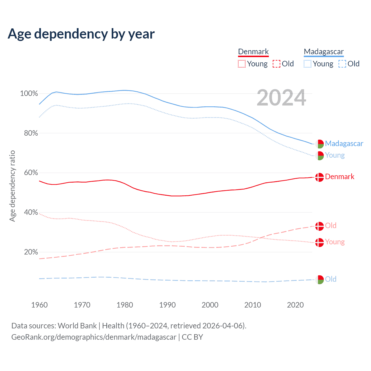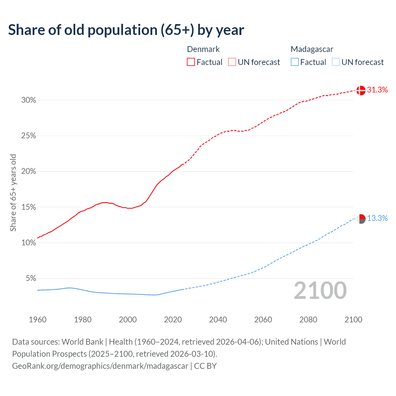 - The share of old-age demographic (65+) in Denmark is 20.9% vs 3.41% in Madagascar.