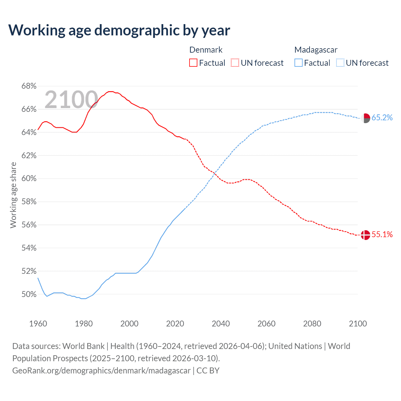 Median age Denmark vs Madagascar, 1960-2100