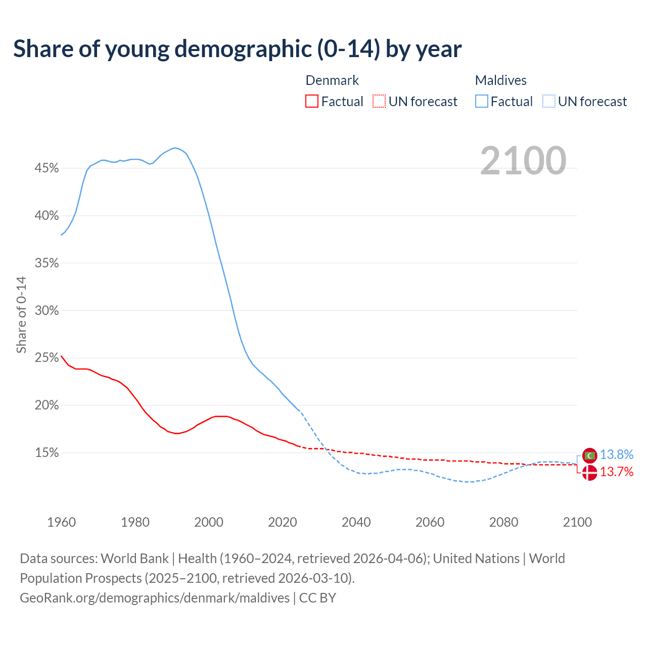 - The share of young demographic (0-15 years old) in Denmark is 15.7% vs 19.6% in Maldives.