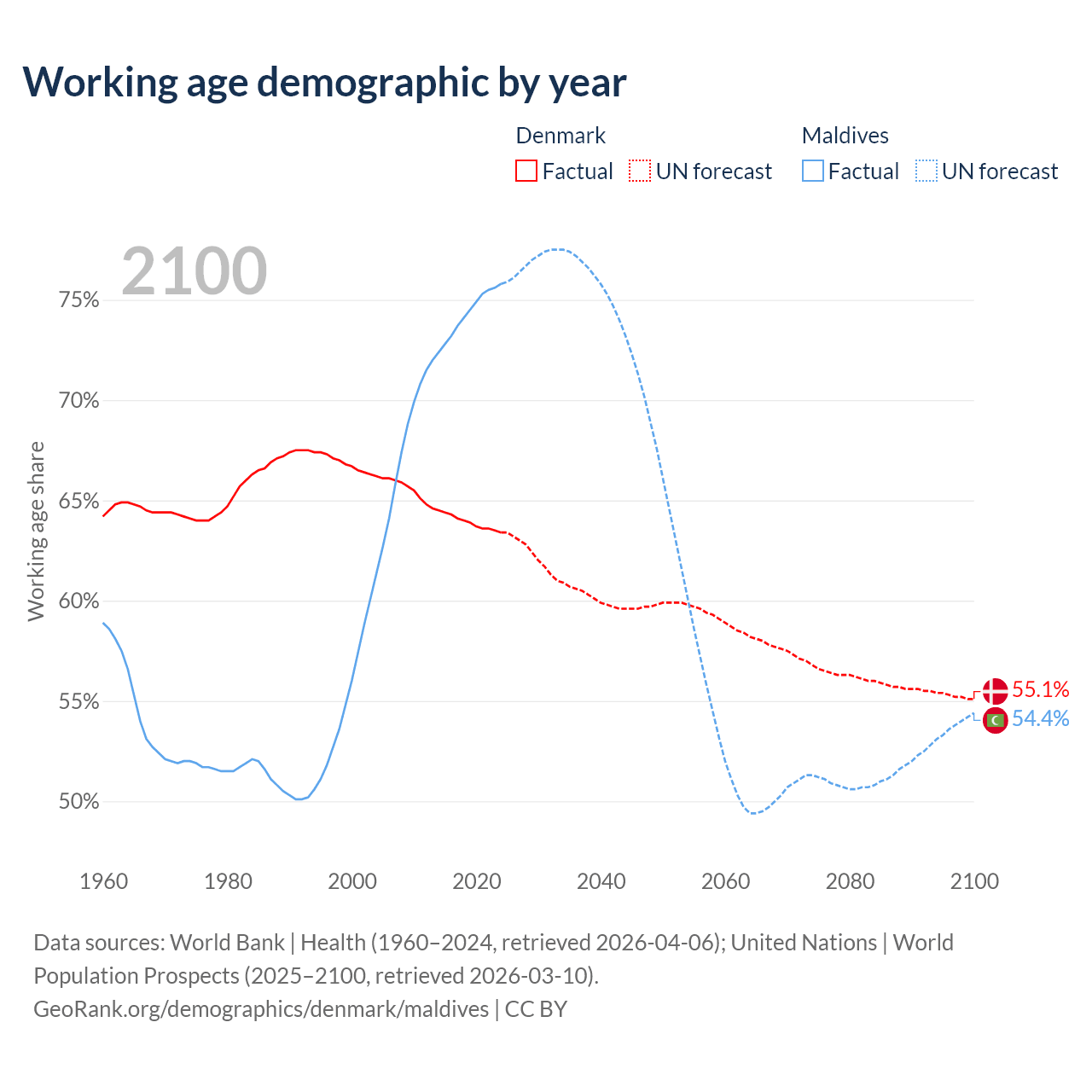 Median age Denmark vs Maldives, 1960-2100