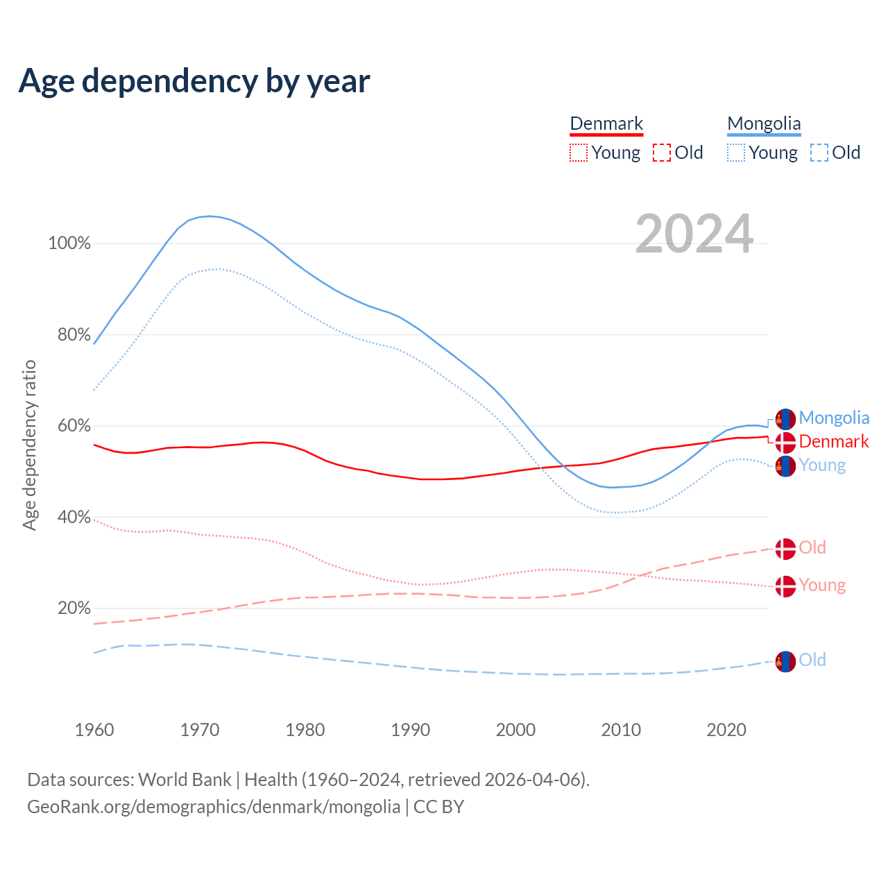 - The share of old-age demographic (65+) in Denmark is 20.9% vs 5.14% in Mongolia.