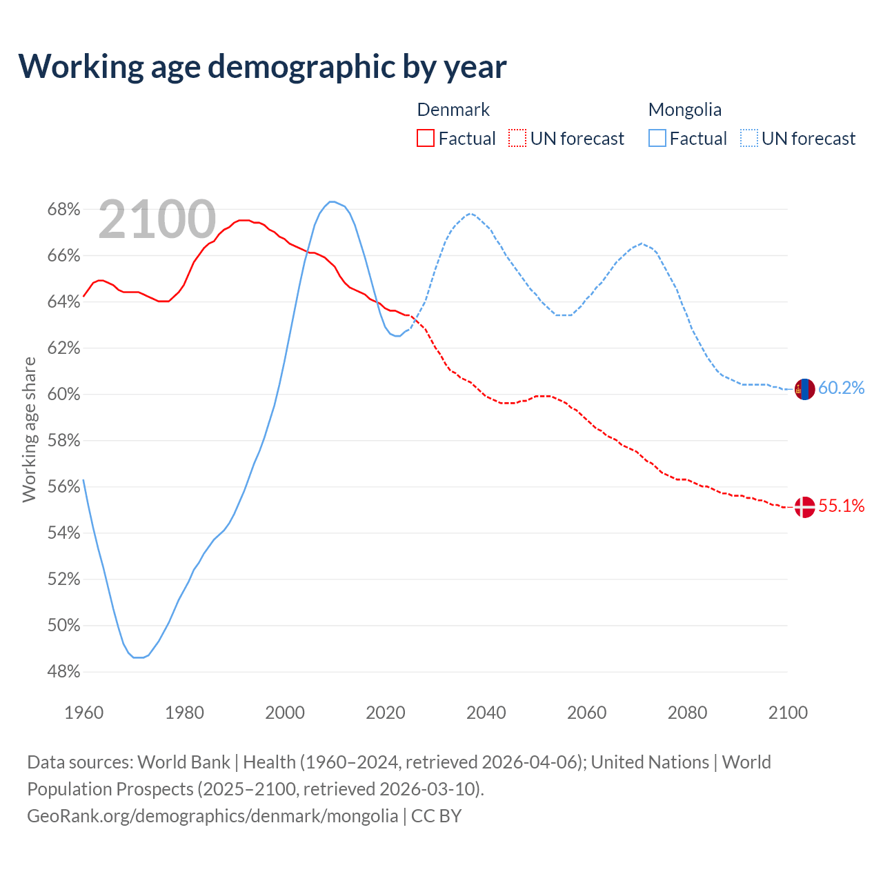 - Denmark has 3.83M working age adults (aged 15-64) vs 2.27M in Mongolia.