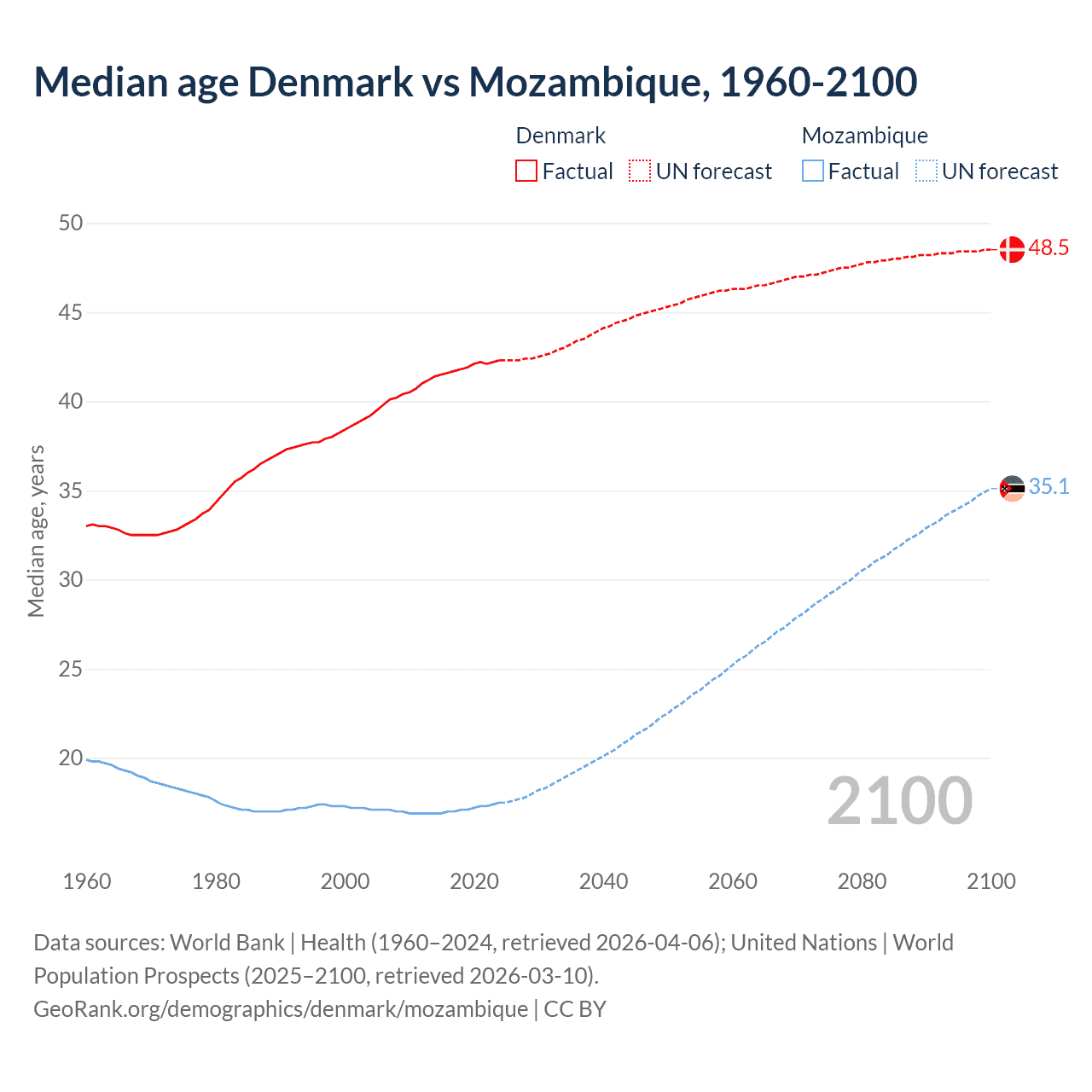 Median age Denmark vs Mozambique, 1960-2100