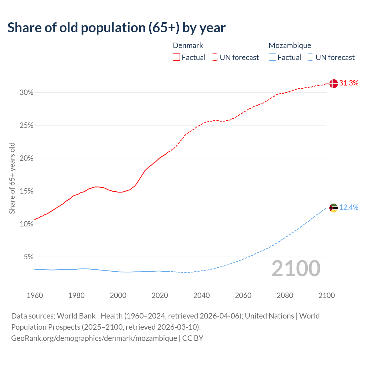 The share of older people aged 65 and over is 20.9% in Denmark and 2.75% in Mozambique. Life expectancy in Denmark compared to Mozambique .