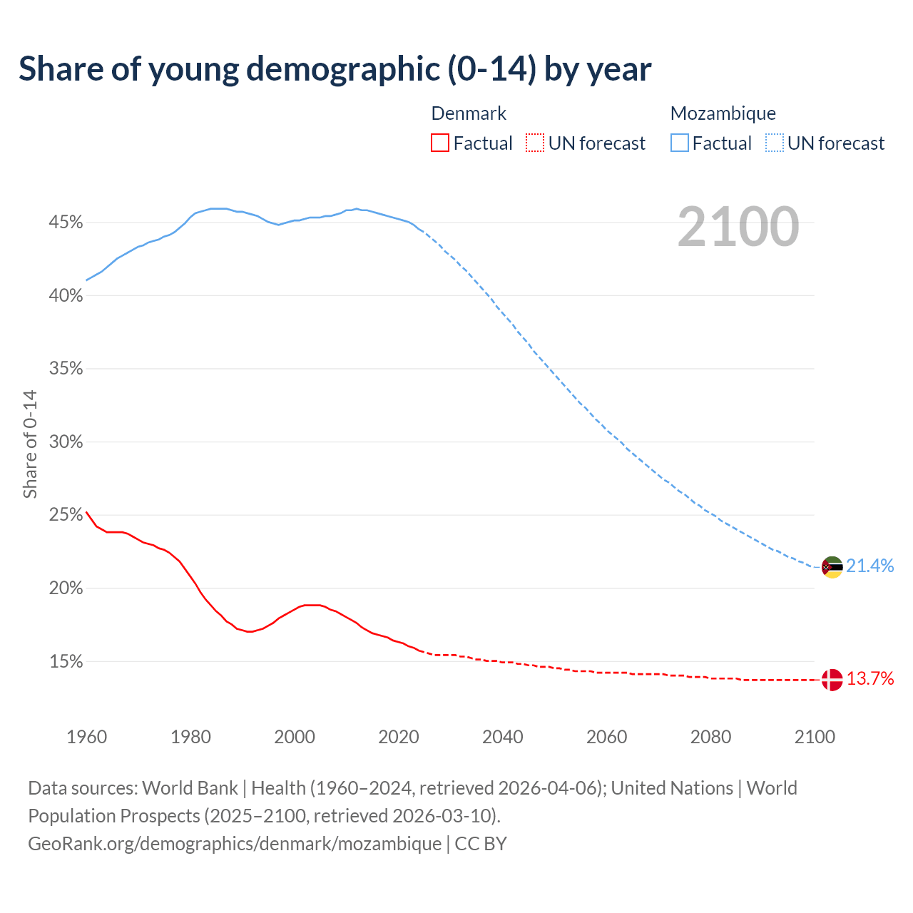 - The share of young demographic (0-15 years old) in Denmark is 15.7% vs 44.5% in Mozambique.