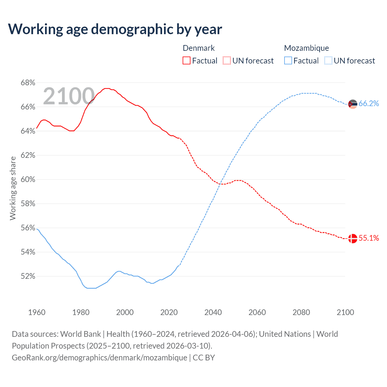 - Denmark has 3.83M working age adults (aged 15-64) vs 19.5M in Mozambique.