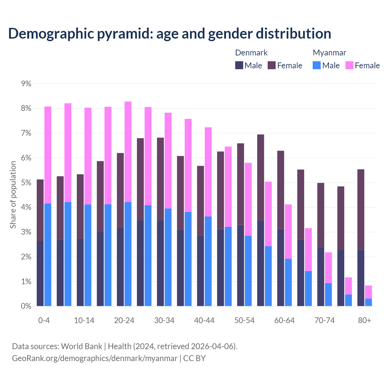 - The share of old-age demographic (65+) in Denmark is 20.9% vs 7.3% in Myanmar.