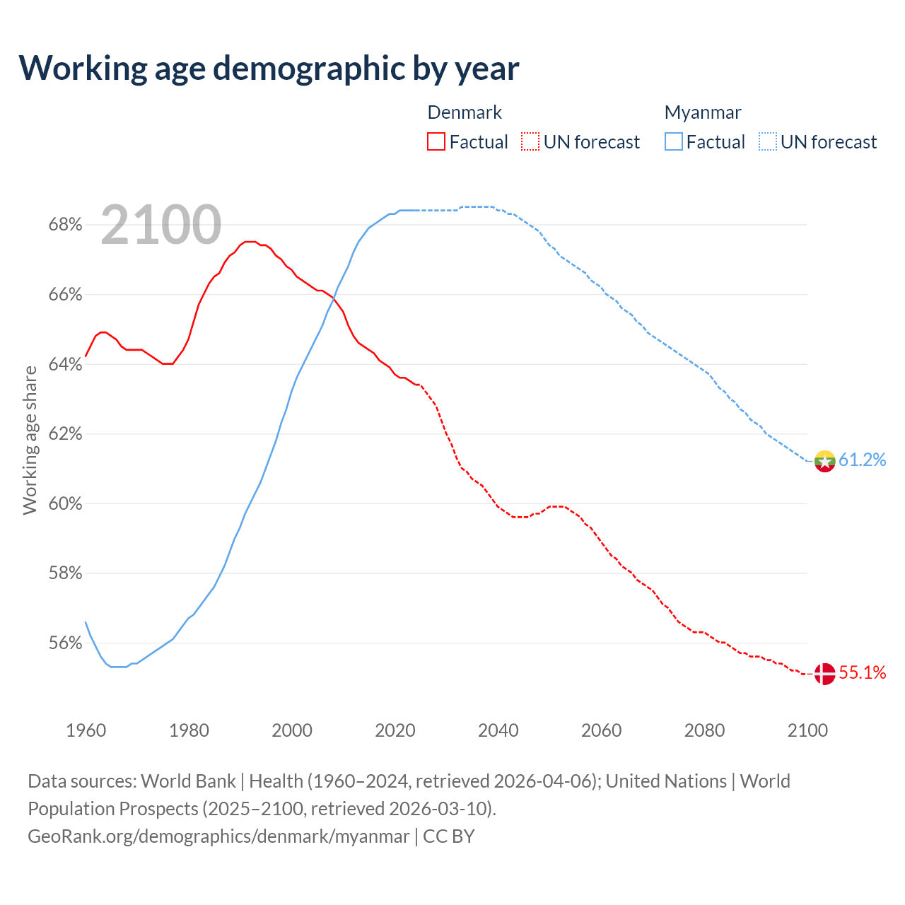 Median age Denmark vs Myanmar, 1960-2100