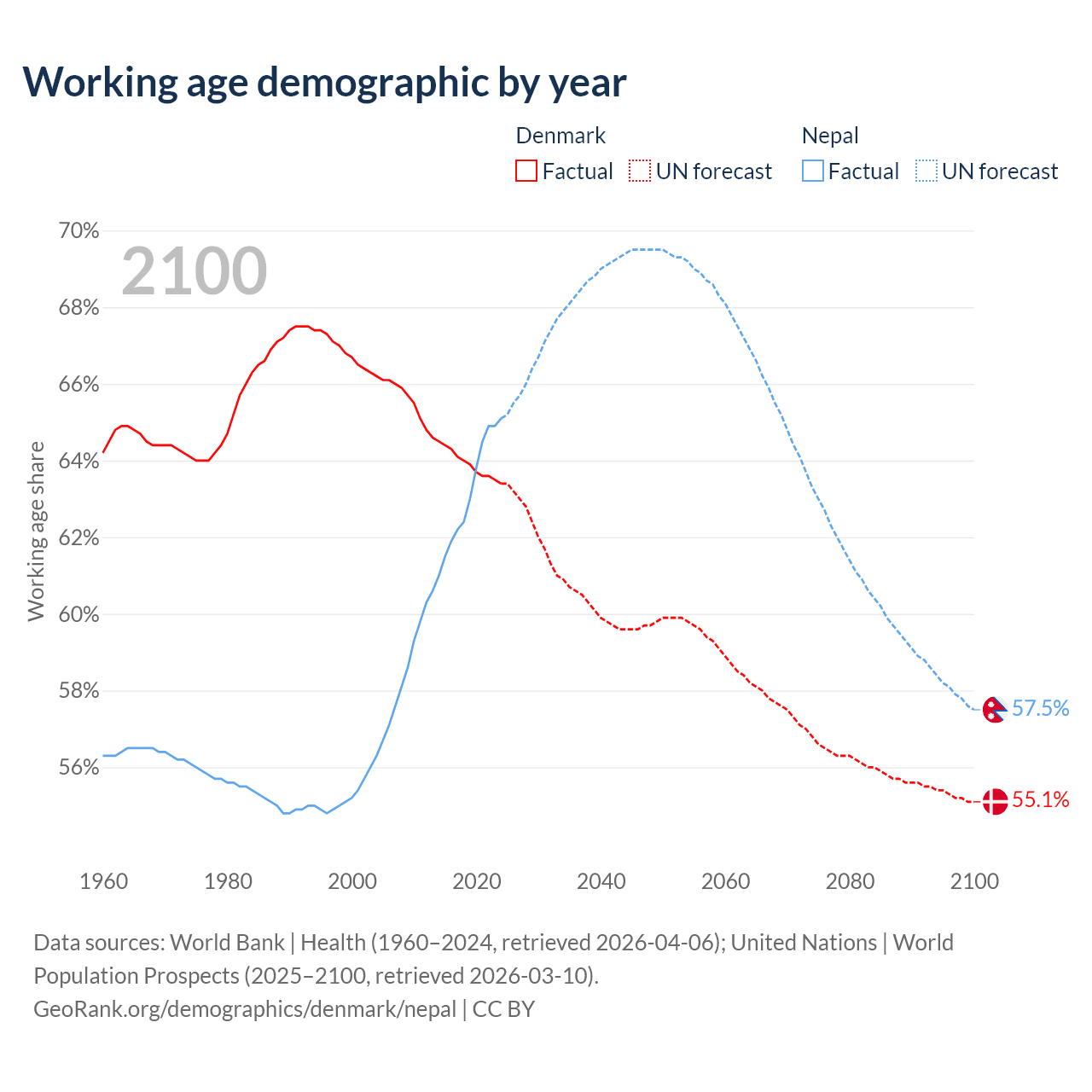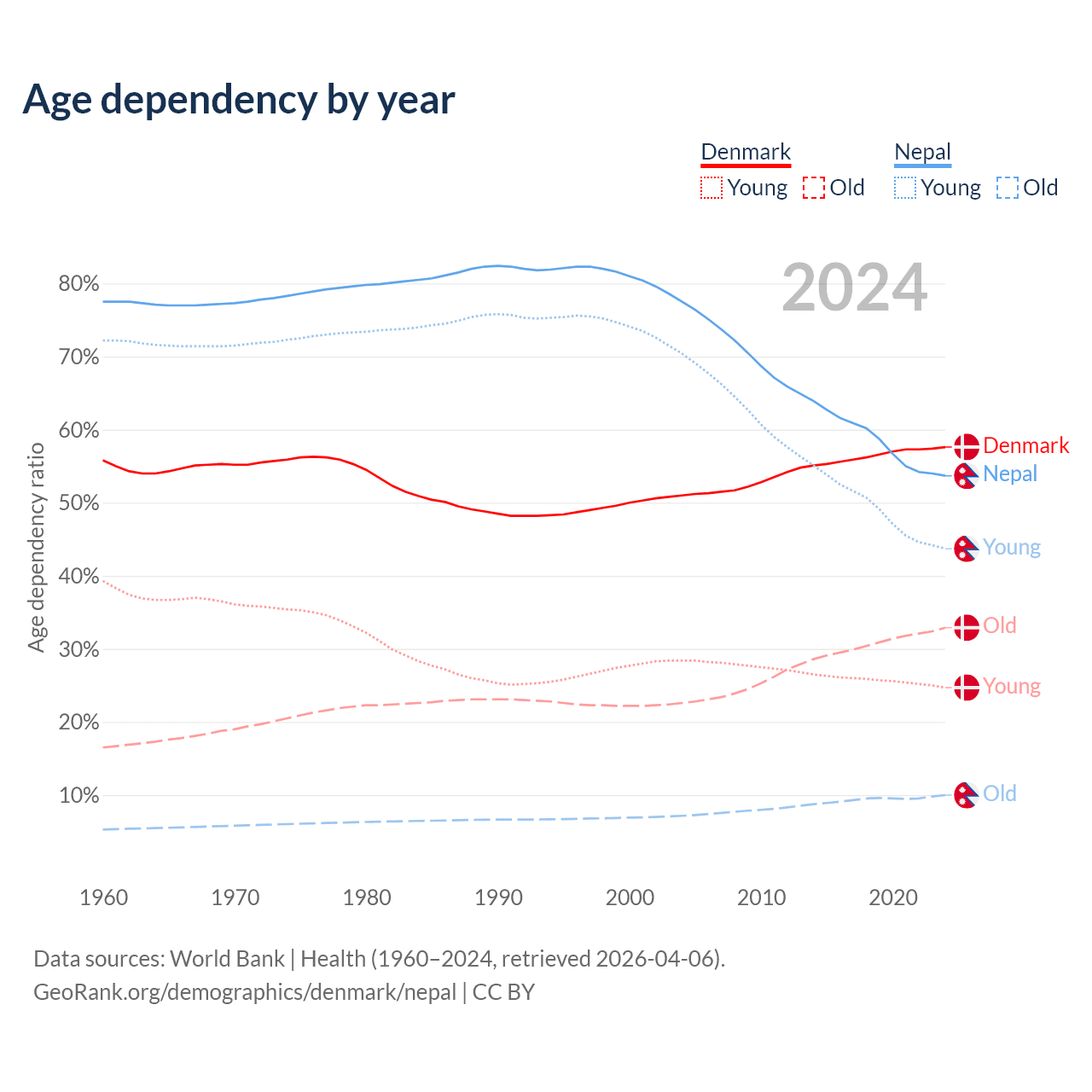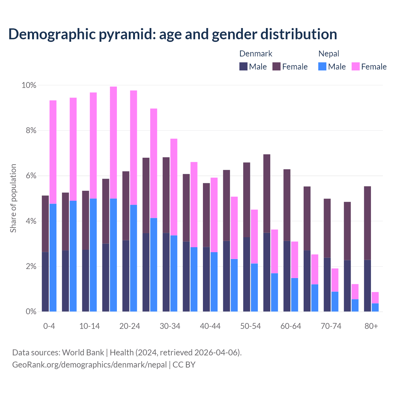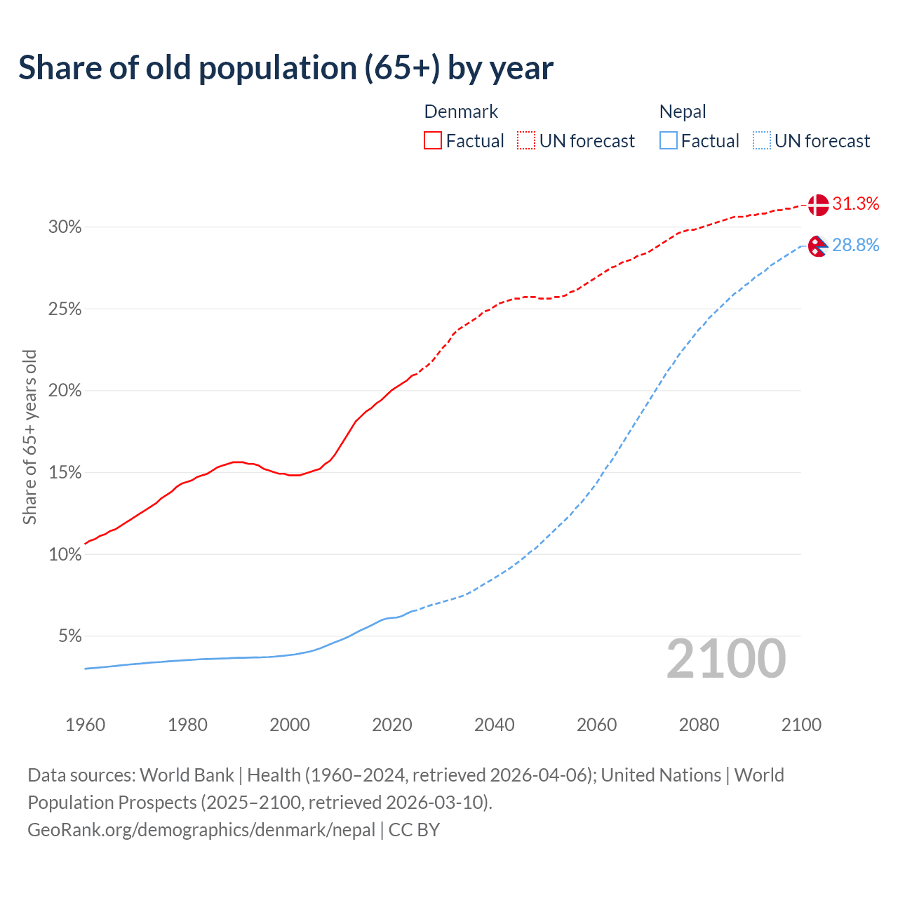 - The share of old-age demographic (65+) in Denmark is 20.9% vs 6.5% in Nepal.