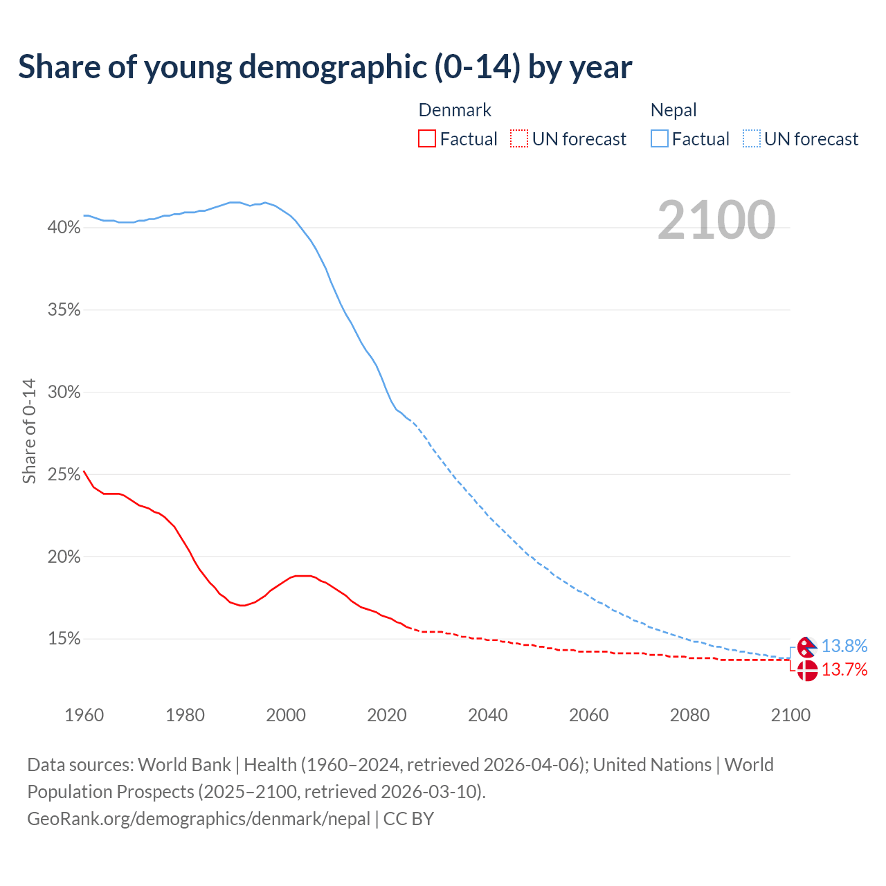 - The share of young demographic (0-15 years old) in Denmark is 15.7% vs 28.4% in Nepal.
