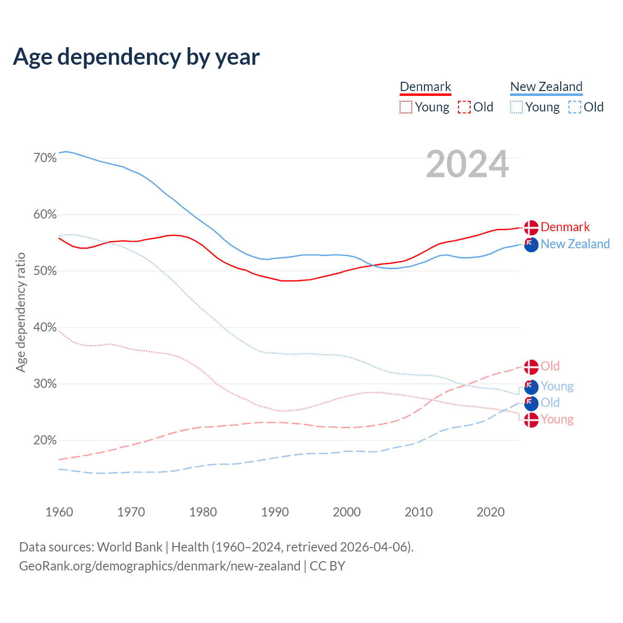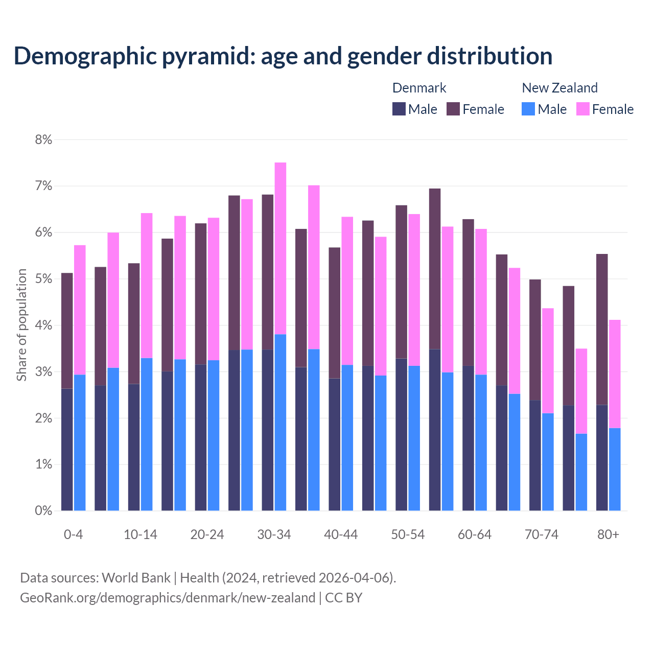 - Denmark is ranked 34/196 by median age (oldest to youngest) vs 56/196 for New Zealand.