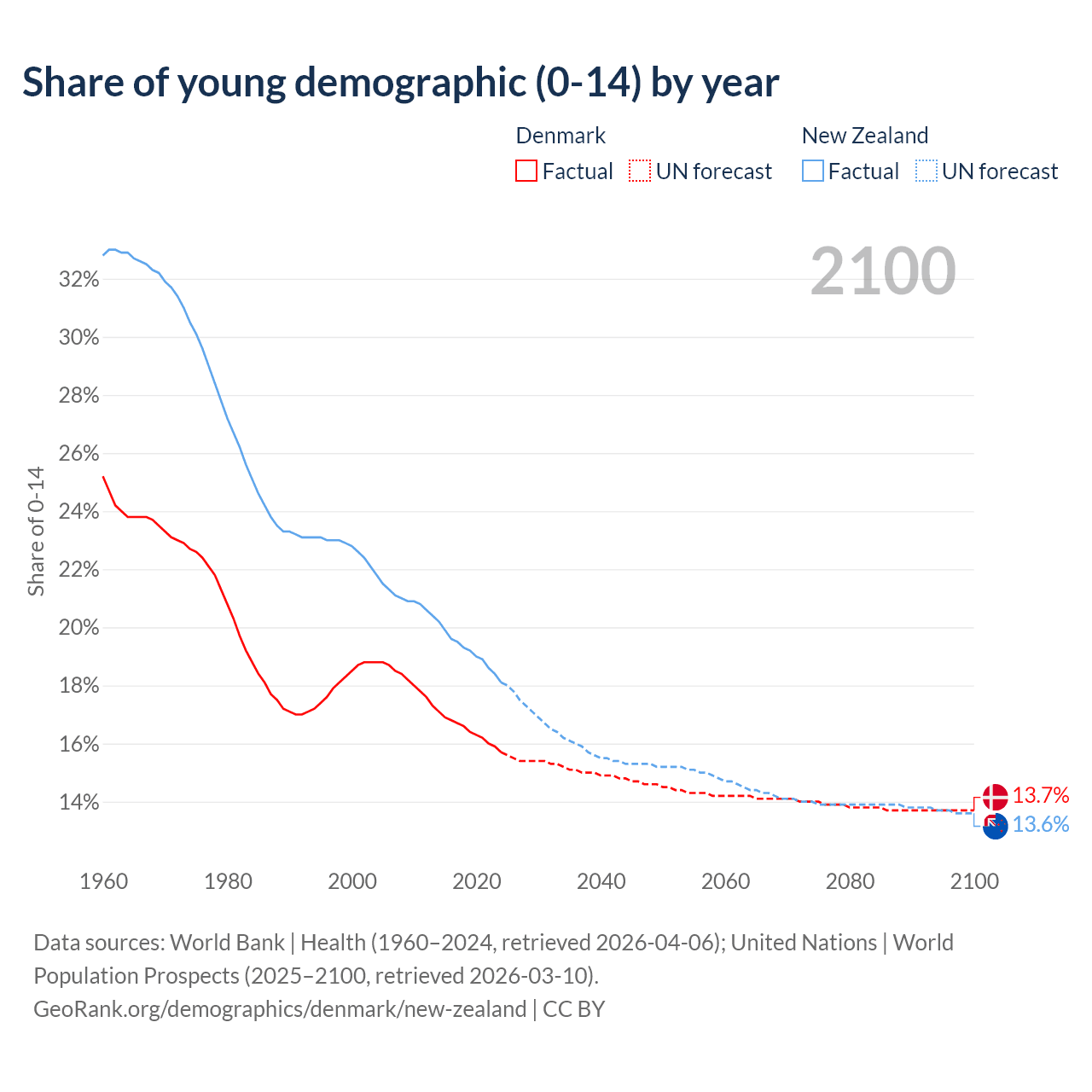 - The share of young demographic (0-15 years old) in Denmark is 15.7% vs 18.1% in New Zealand.