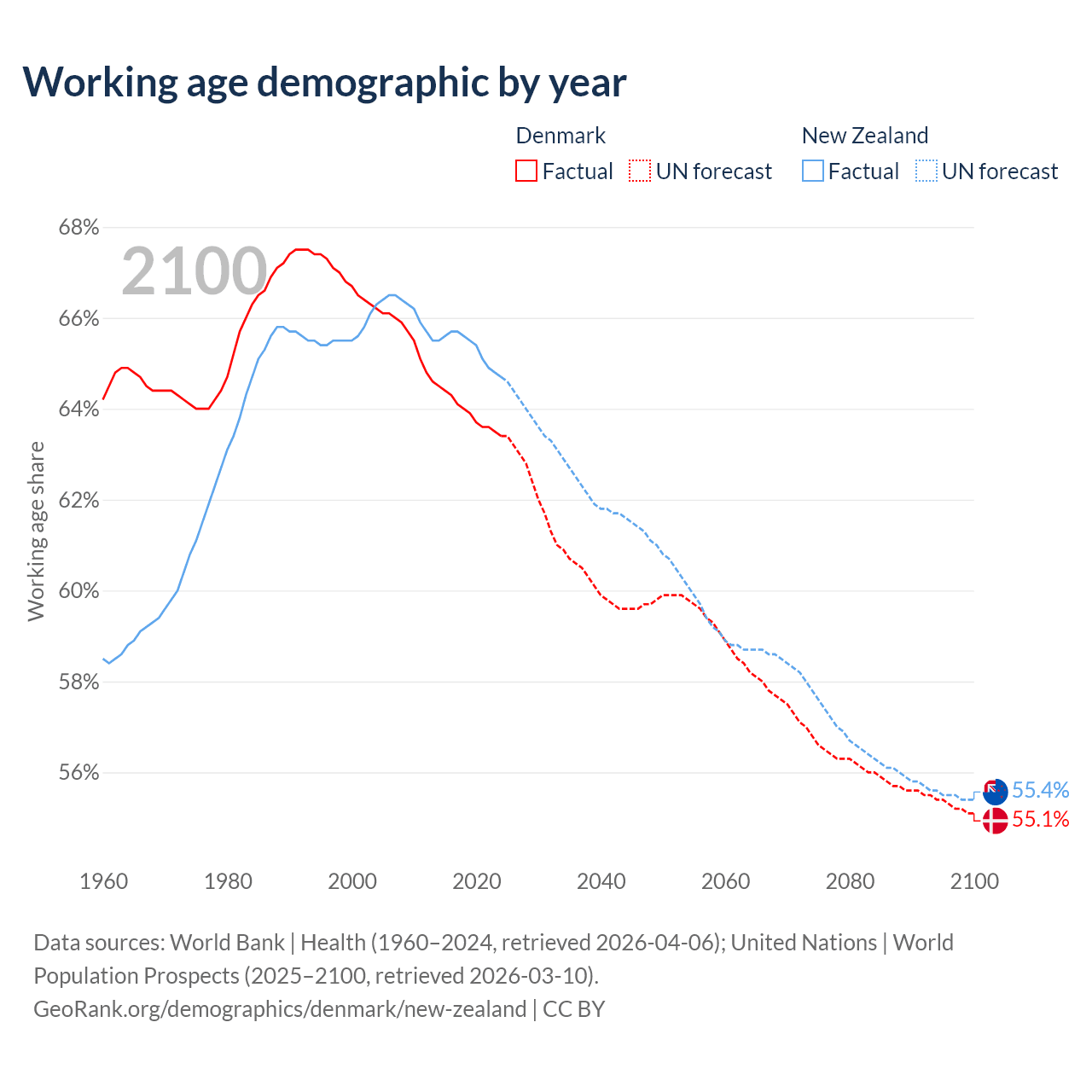 - Denmark has 3.83M working age adults (aged 15-64) vs 3.48M in New Zealand.