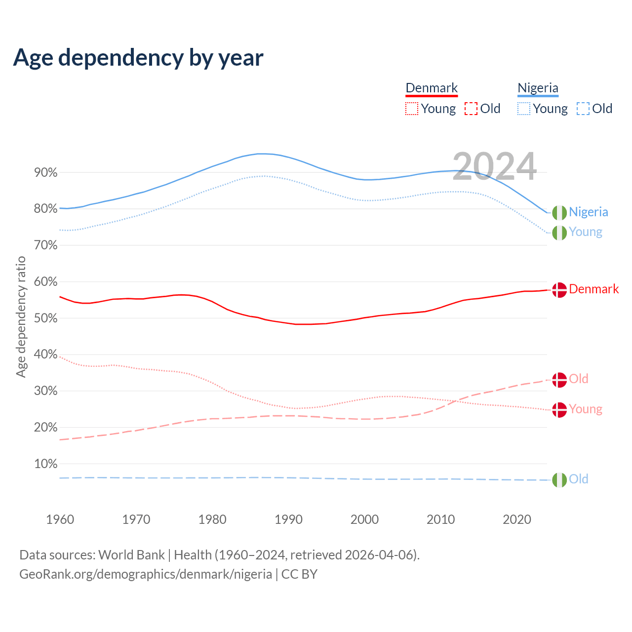 - Denmark is ranked 34/196 by median age (oldest to youngest) vs 178/196 for Nigeria.