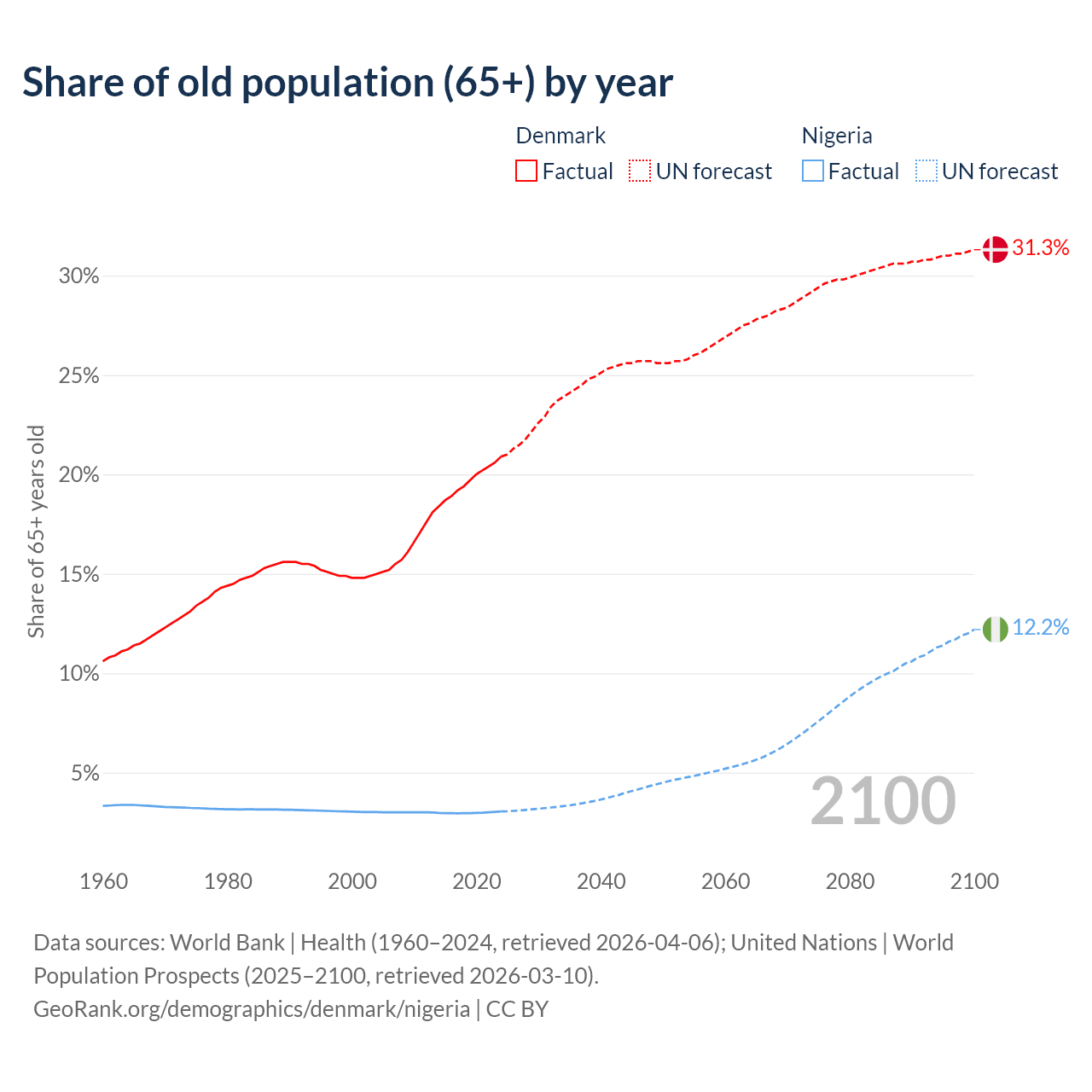 The share of older people aged 65 and over is 20.9% in Denmark and 3.05% in Nigeria. Life expectancy in Denmark compared to Nigeria .