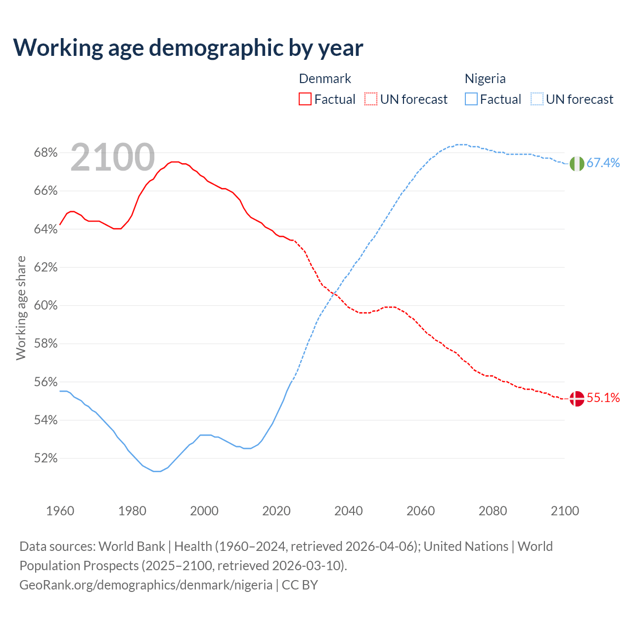 - Denmark has 3.83M working age adults (aged 15-64) vs 136M in Nigeria.