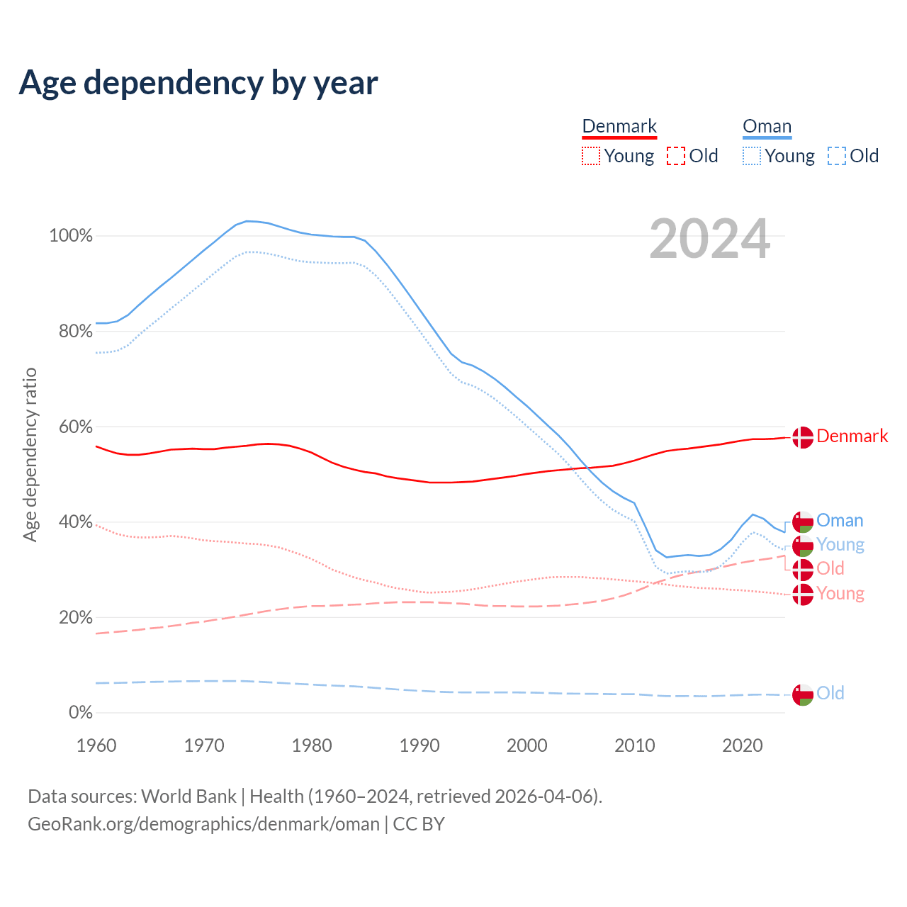 - Denmark is ranked 34/196 by median age (oldest to youngest) vs 101/196 for Oman.