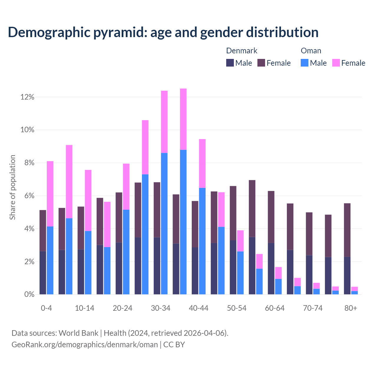 - As of 2026, the population of Denmark is 6.03M vs 5.76M in Oman.