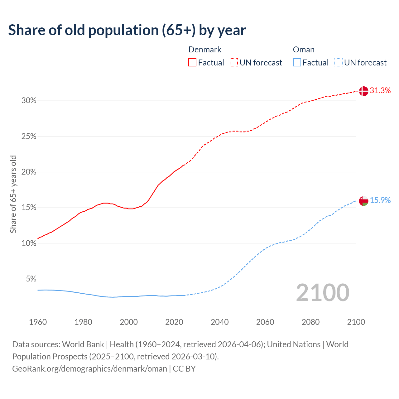 The share of older people aged 65 and over is 20.9% in Denmark and 2.64% in Oman. Life expectancy in Denmark compared to Oman .