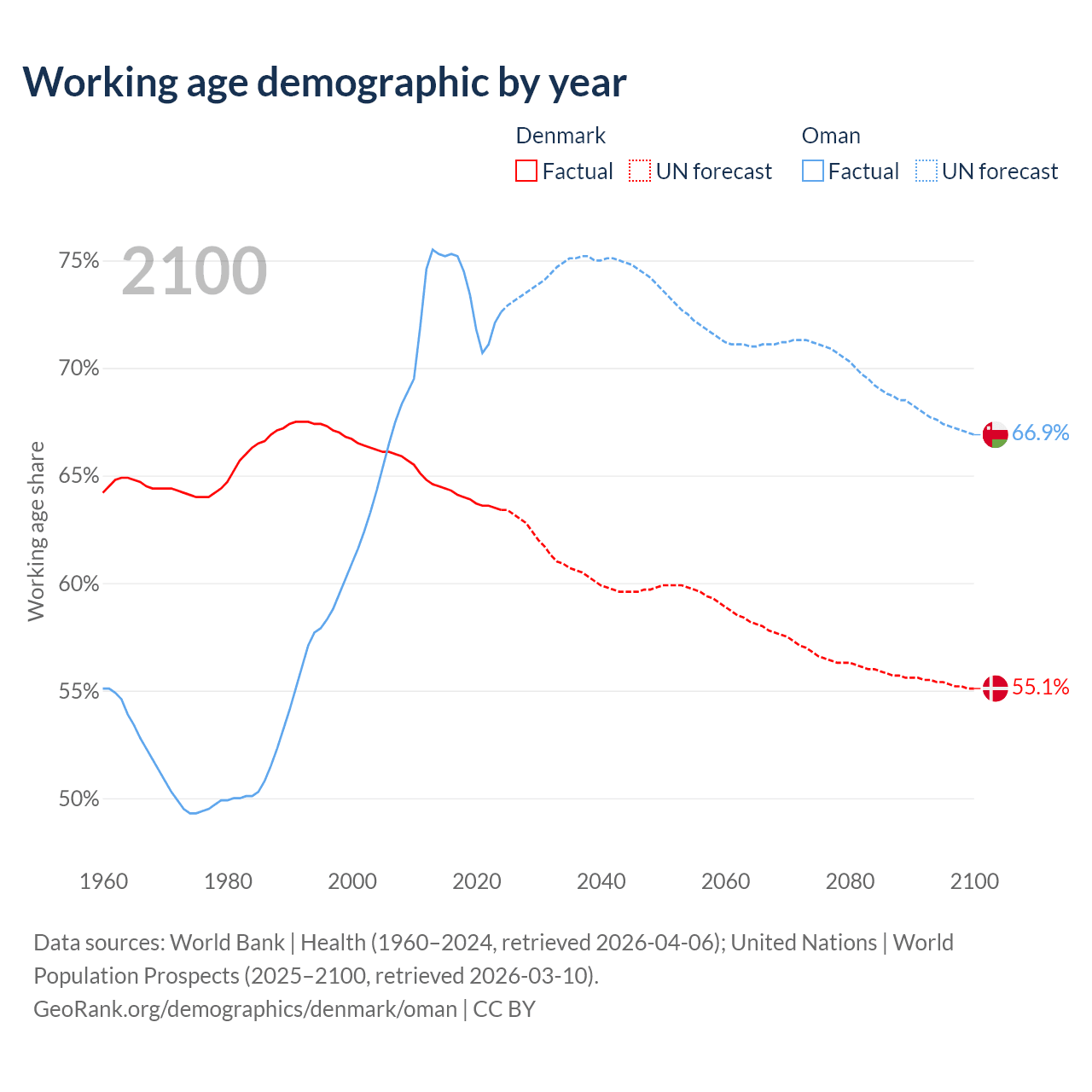 - Denmark has 3.83M working age adults (aged 15-64) vs 4.19M in Oman.