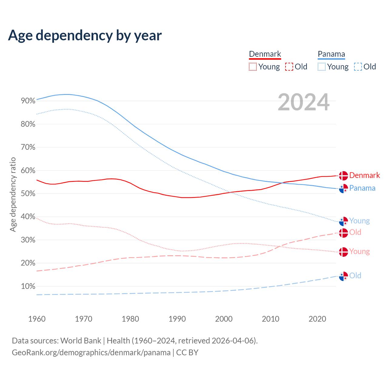 - The share of old-age demographic (65+) in Denmark is 20.9% vs 9.35% in Panama.